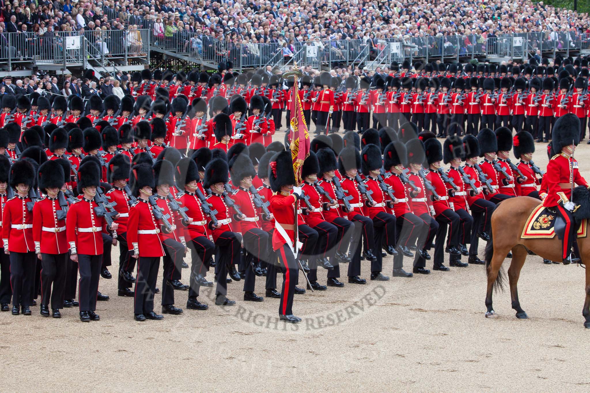 Trooping the Colour 2012: The Ensign, Second Lieutenant H C Codrington, carrying the Colour during the March Past, is now in the right position to carry the Colour past HM The Queen.. Horse Guards Parade, Westminster, London SW1, United Kingdom, on 16 June 2012 at 11:35, image #406