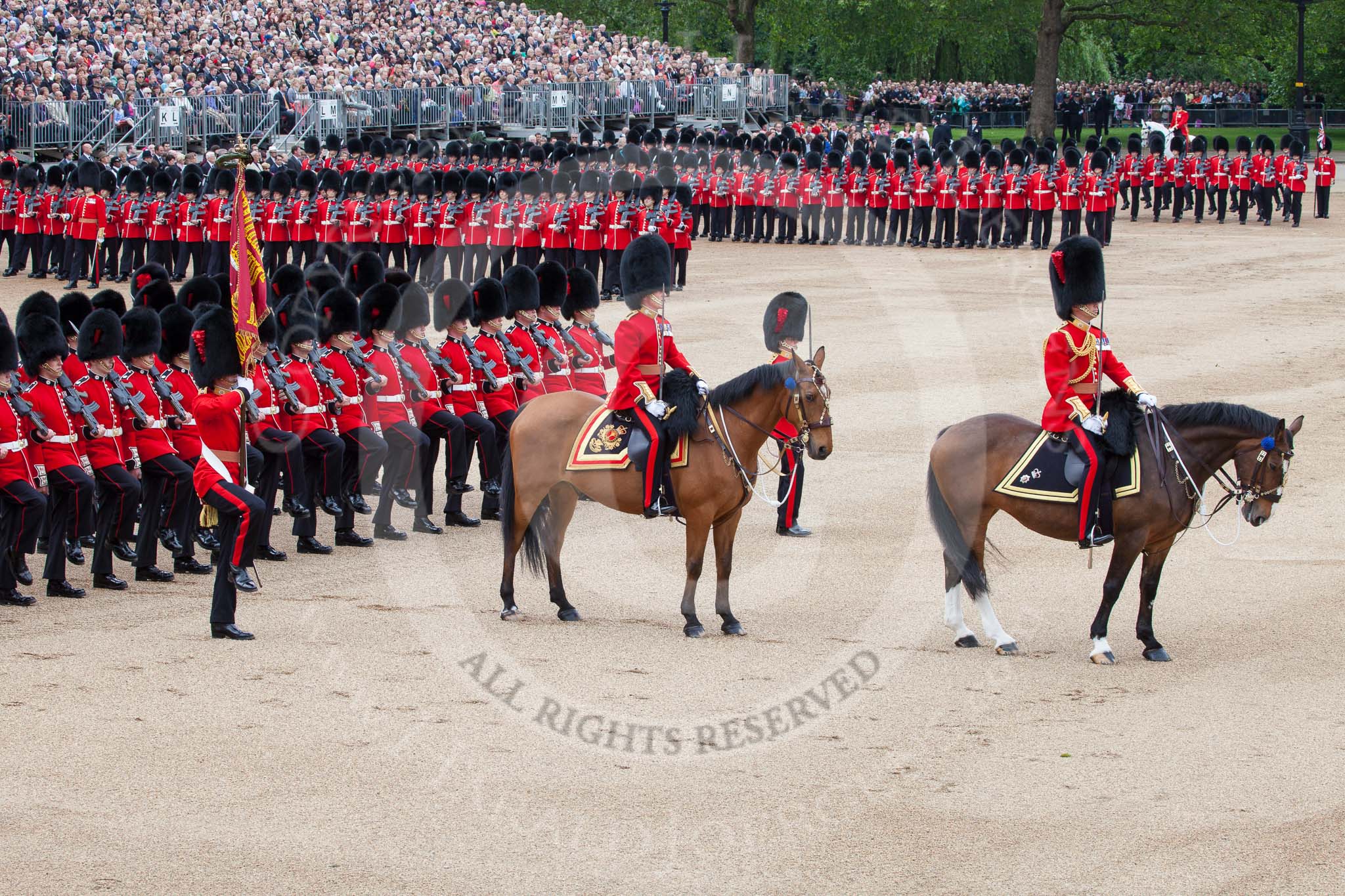 Trooping the Colour 2012: About to march past Her Majesty - the Major of the Parade, Major Mark Lewis, Welsh Guards, the Ensign, Second Lieutenant Hugo Codrington, carrying the Colour, and the guards divisions.. Horse Guards Parade, Westminster, London SW1, United Kingdom, on 16 June 2012 at 11:36, image #412