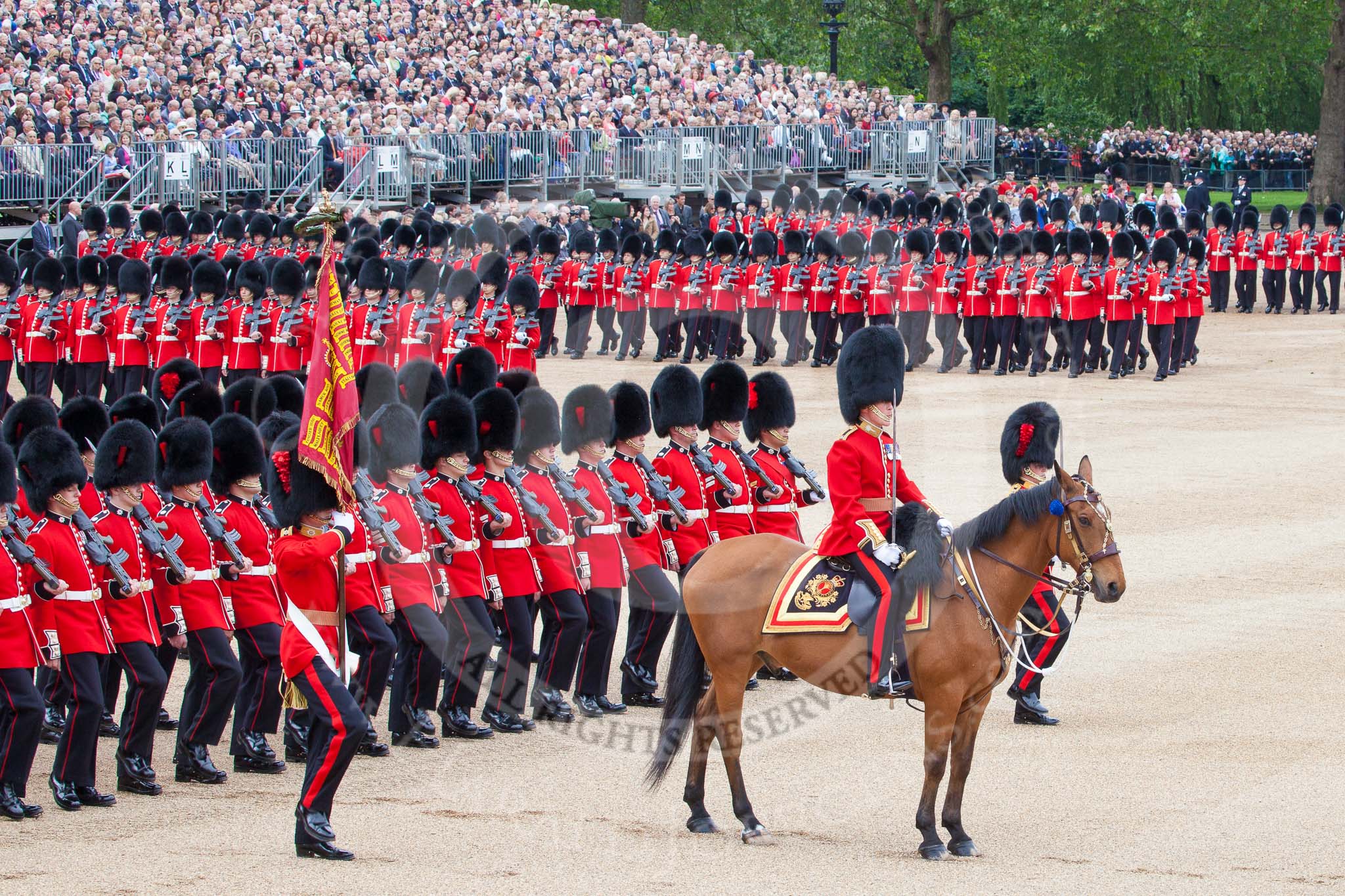 Trooping the Colour 2012: About to march past Her Majesty - the Ensign, Second Lieutenant Hugo Codrington, carrying the Colour in front of No. 1 Guard, the Escort to the Colour.. Horse Guards Parade, Westminster, London SW1, United Kingdom, on 16 June 2012 at 11:36, image #420
