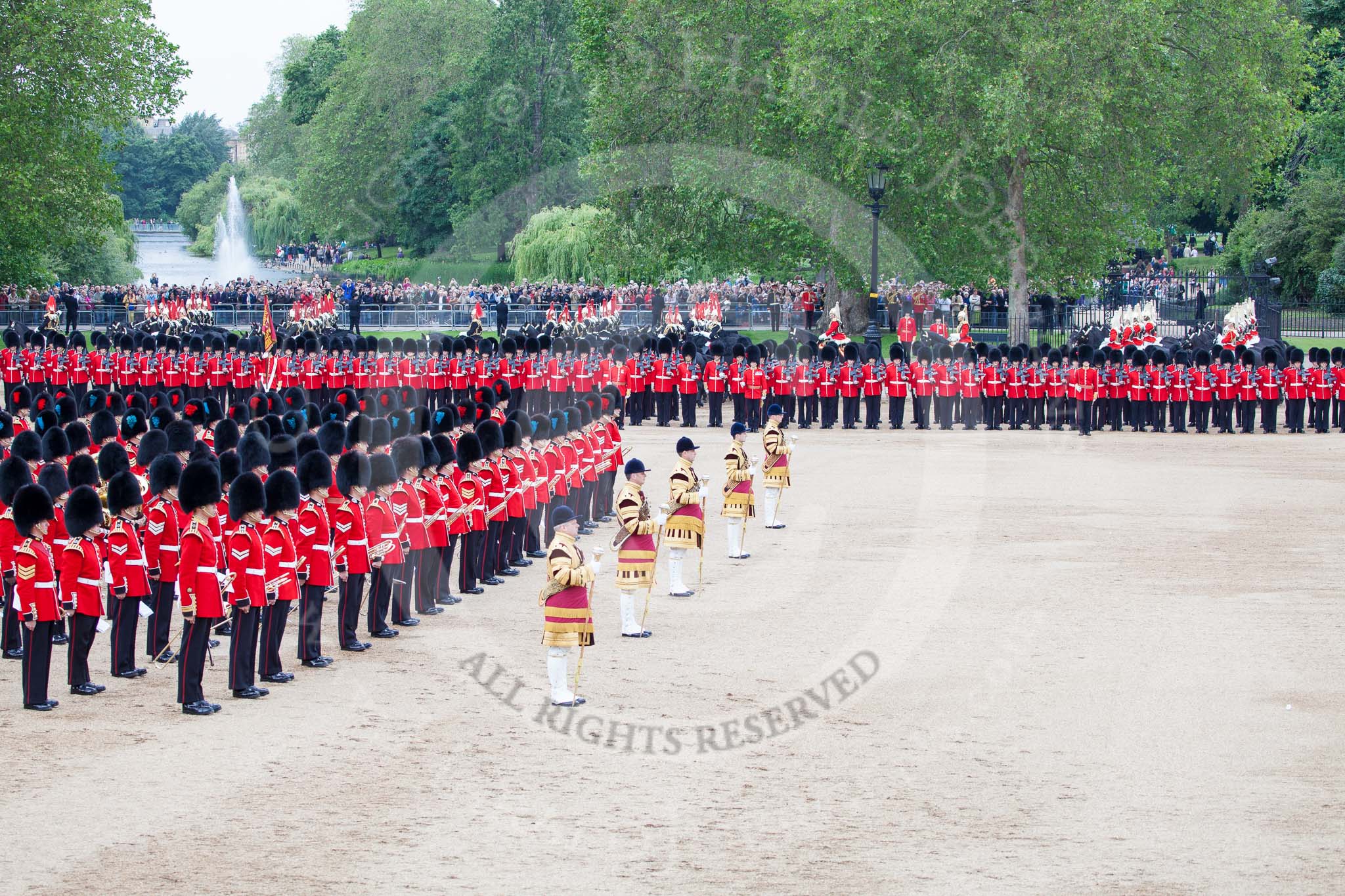 Trooping the Colour 2012: The Ride Past - the Massed Bands are in the western half of the parade ground, the Royal Horse Artillery and the Household Cavalry riding behind them, and behind the line of guardsmen, as seen here.. Horse Guards Parade, Westminster, London SW1, United Kingdom, on 16 June 2012 at 11:54, image #537
