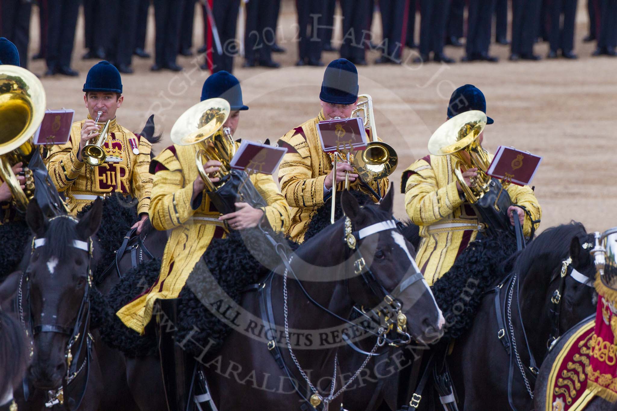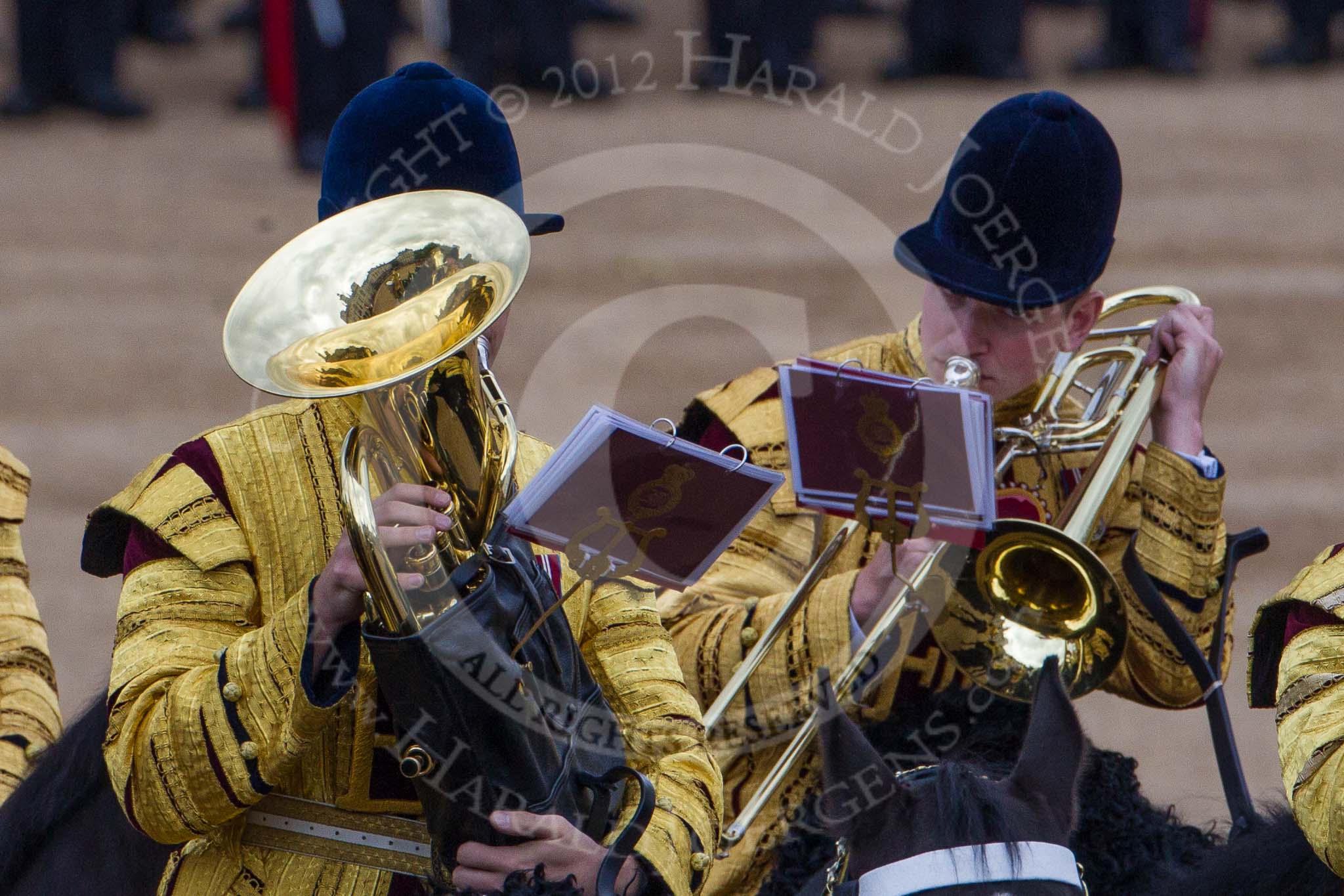Trooping the Colour 2012: Musicians from the Mounted Bands of the Household Cavalry playing during the Ride Past.. Horse Guards Parade, Westminster, London SW1, United Kingdom, on 16 June 2012 at 11:57, image #575