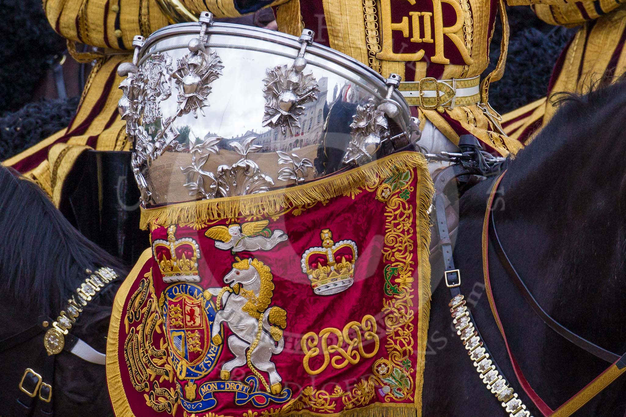 Trooping the Colour 2012: Closer look at a kettle drum. The Mounted Bands of the Household Cavalry during the Ride Past.. Horse Guards Parade, Westminster, London SW1, United Kingdom, on 16 June 2012 at 11:57, image #579