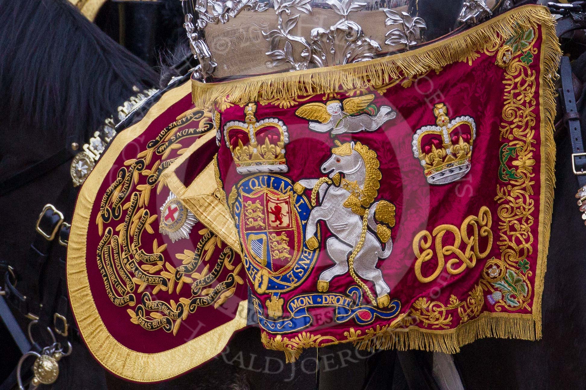 Trooping the Colour 2012: A closer look at the Banner on Kettledrum of The Life Guards. The Mounted Bands of the Household Cavalry during the Ride Past.. Horse Guards Parade, Westminster, London SW1, United Kingdom, on 16 June 2012 at 11:57, image #580