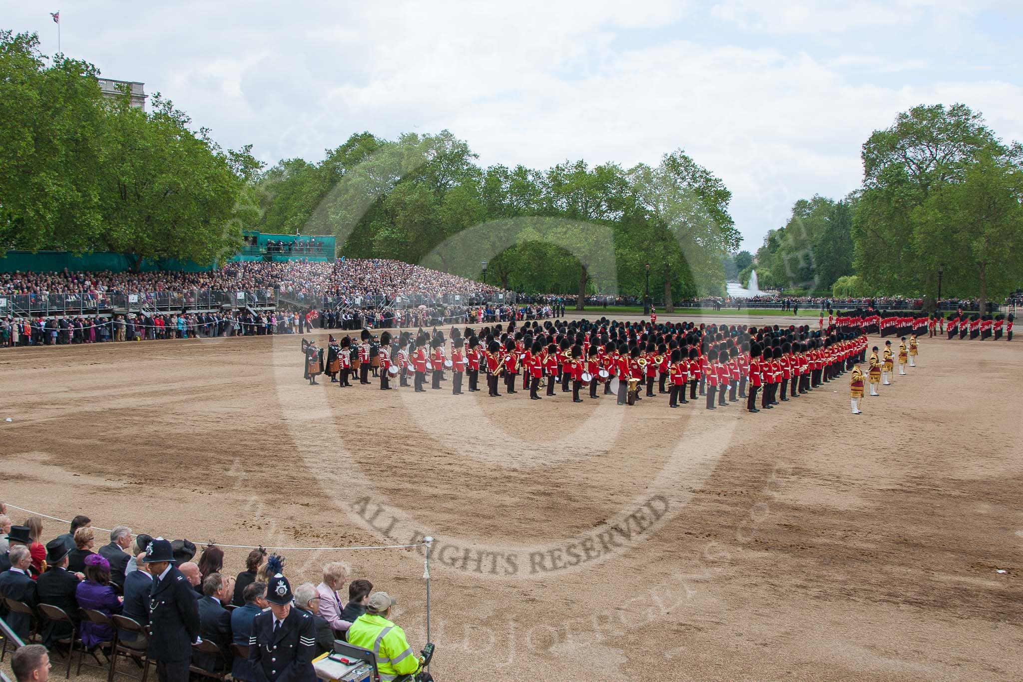 Trooping the Colour 2012: Horse Guards Parade as the troops are getting ready for the March Off, the Massed Bands in position on the left, No. 1 to No. 6 Guard on the Northern side of the parade ground.. Horse Guards Parade, Westminster, London SW1, United Kingdom, on 16 June 2012 at 12:07, image #633