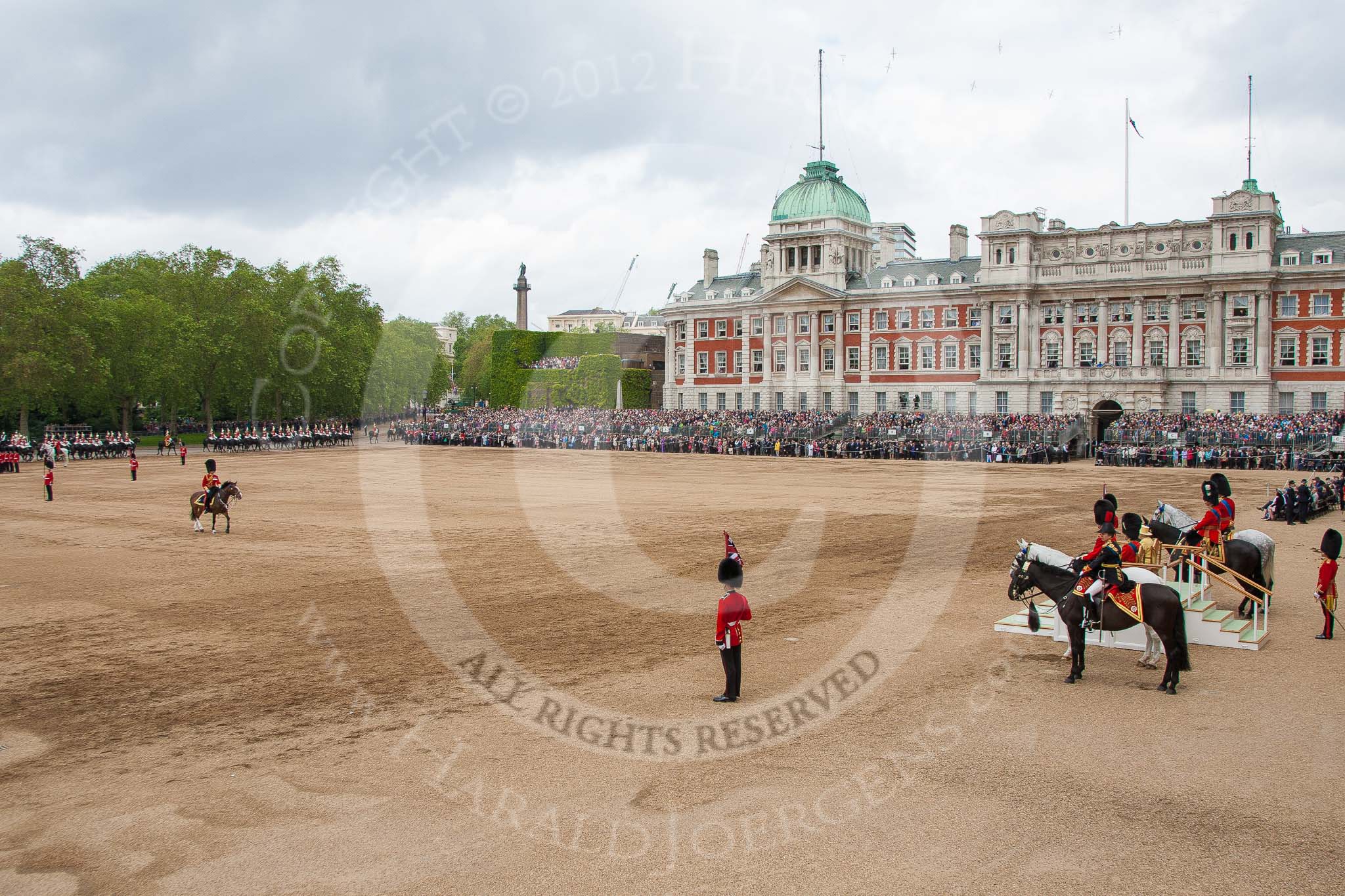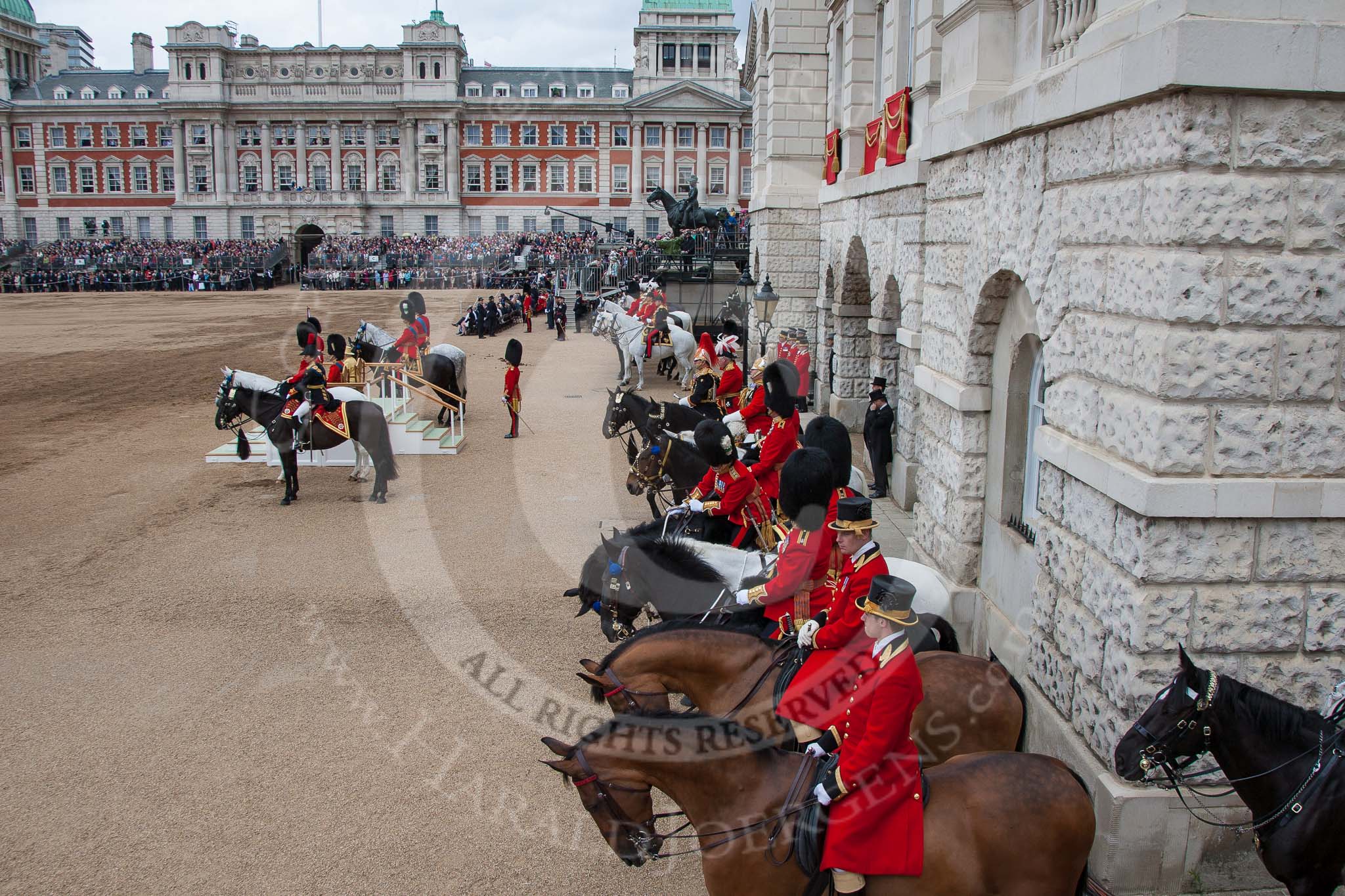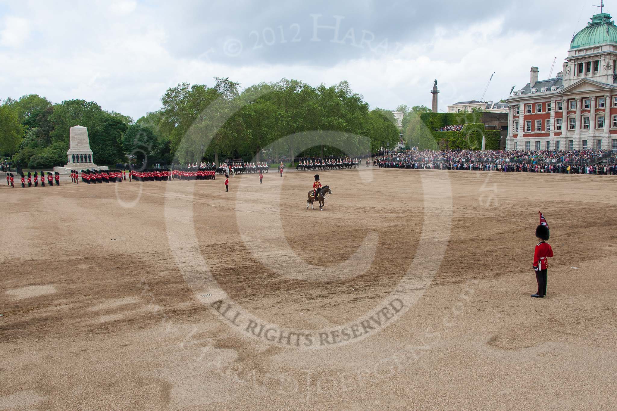 Trooping the Colour 2012: Horse Guards Parade as the troops are getting ready for the March Off. The Field Officer is riding towards Her Majesty to inform her that Her Guards are ready to march off.. Horse Guards Parade, Westminster, London SW1, United Kingdom, on 16 June 2012 at 12:07, image #635