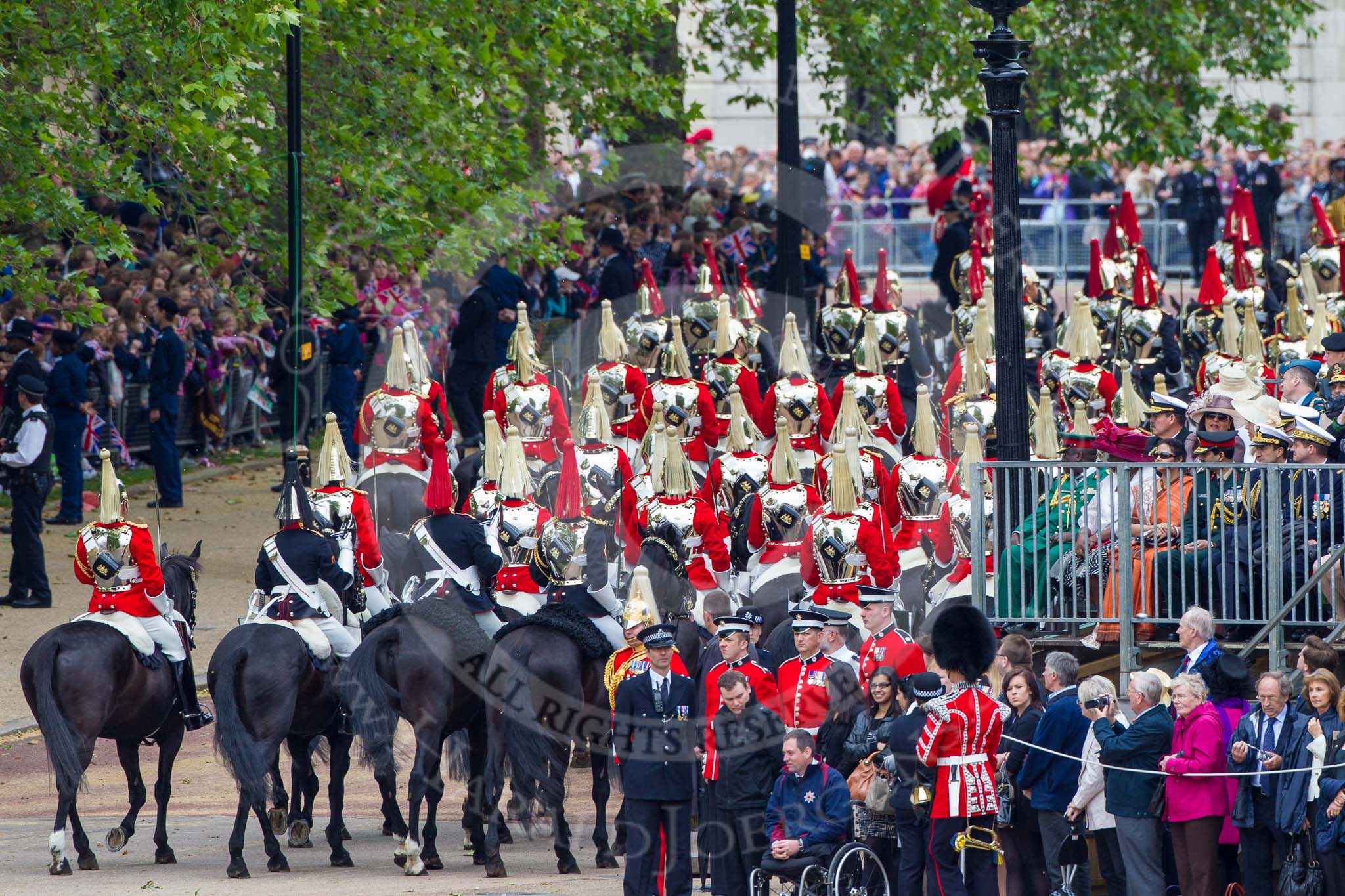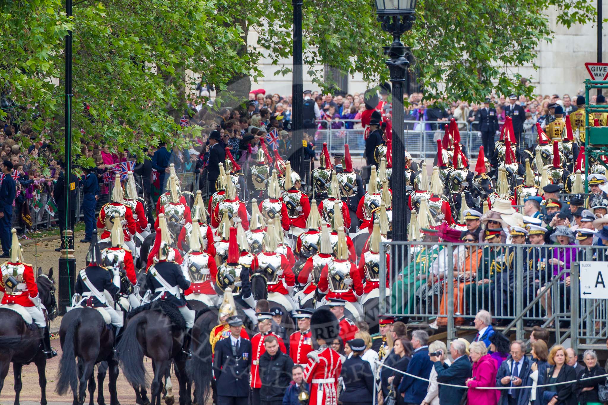 Trooping the Colour 2012: The March Off - The Live Guards are leaving via the access road to The Mall, in front of them, with the red plumes, The Blues and Royals.. Horse Guards Parade, Westminster, London SW1, United Kingdom, on 16 June 2012 at 12:08, image #644