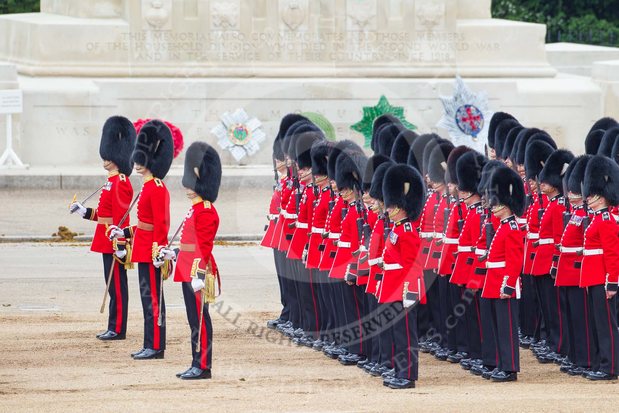 Trooping the Colour 2012: The troops are ready for the March Off - here No. 4 Guard, Nijmegen Company Grenadier Guards, in front of the Guards Memorial.. Horse Guards Parade, Westminster, London SW1, United Kingdom, on 16 June 2012 at 12:08, image #645
