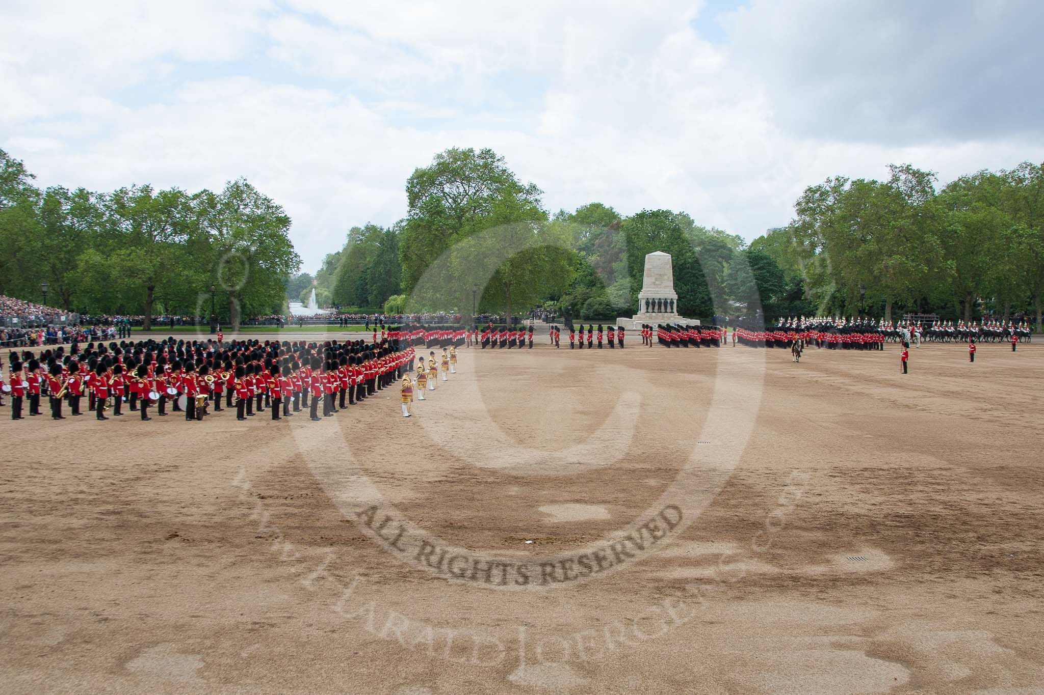 Trooping the Colour 2012: Horse Guards Parade as the troops are getting ready for the March Off, the Massed Bands in position on the left, No. 1 to No. 6 Guard in front of the Guards Memorial, and the Household Cavalry leaving towards The Mall on the right.. Horse Guards Parade, Westminster, London SW1, United Kingdom, on 16 June 2012 at 12:07, image #632