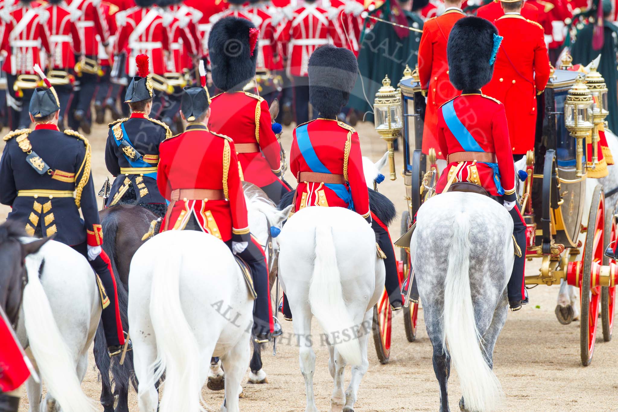 Trooping the Colour 2012: The March Off - the Massed Bands are leaving Horse Guards Parade towards The Mall, followed by HM The Queen in the Glass Coach. Behind them the Field Officer (second from the left) and the Royal Colonels - HRH The Dukeof Kent, HRH The The of Cambridge, and on the right HRH The Prince of Wales.. Horse Guards Parade, Westminster, London SW1, United Kingdom, on 16 June 2012 at 12:12, image #677