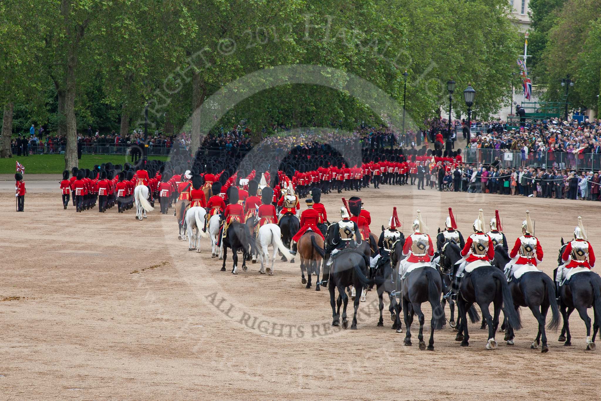 Trooping the Colour 2012: The March Off - behind all the guardsmen a part of the Royal Procession.. Horse Guards Parade, Westminster, London SW1, United Kingdom, on 16 June 2012 at 12:13, image #687