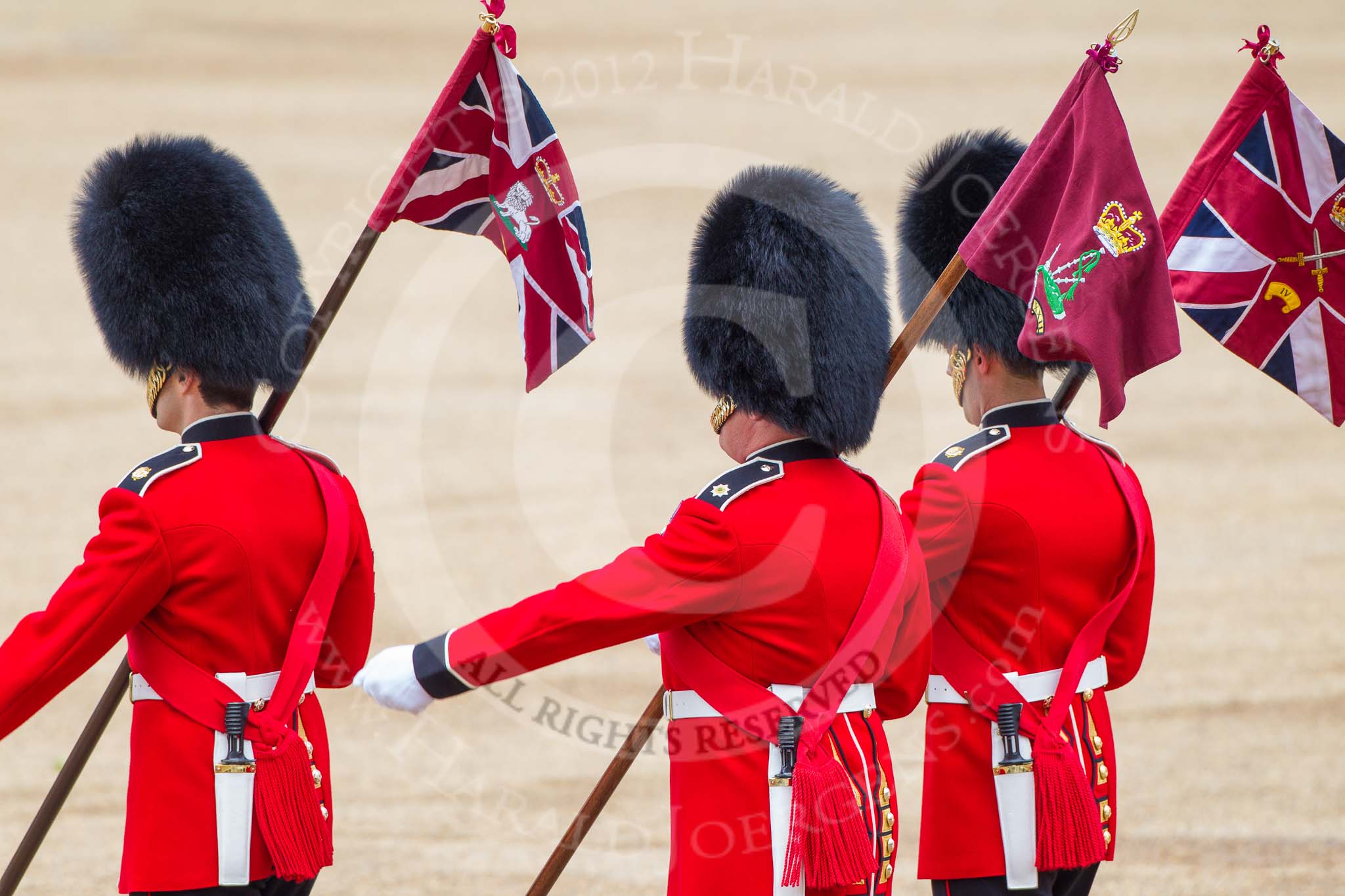 Trooping the Colour 2012: "Keepers of the Ground" with the regimental flags on the march again after the parade.. Horse Guards Parade, Westminster, London SW1, United Kingdom, on 16 June 2012 at 12:15, image #693