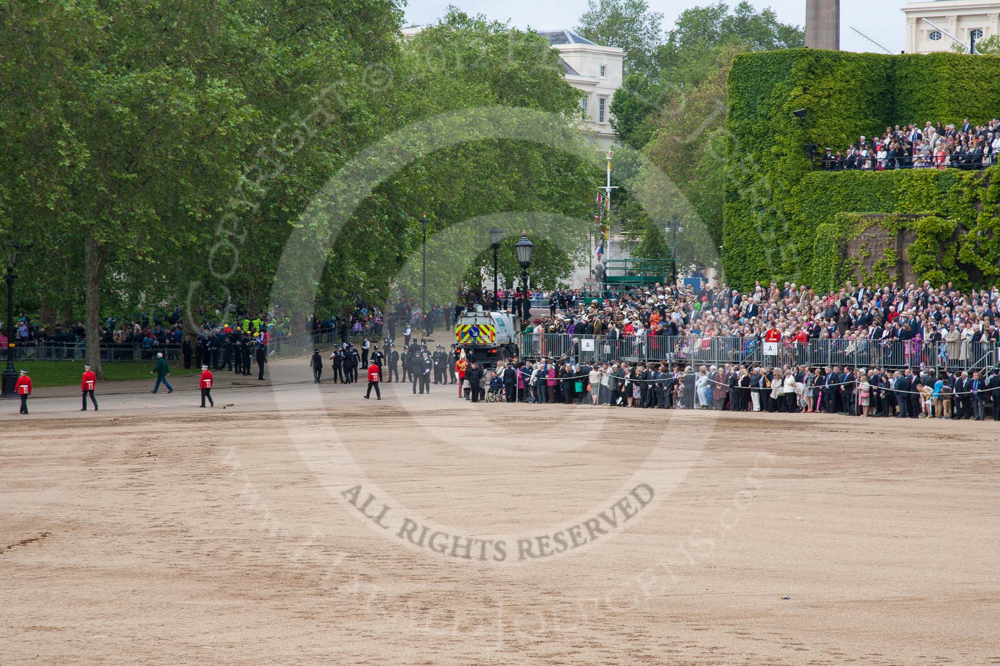 Trooping the Colour 2012: After the parade - the access road to The Mall is cleared whilst the spectators in front and up the ivy covered Citadel wait.. Horse Guards Parade, Westminster, London SW1, United Kingdom, on 16 June 2012 at 12:18, image #701