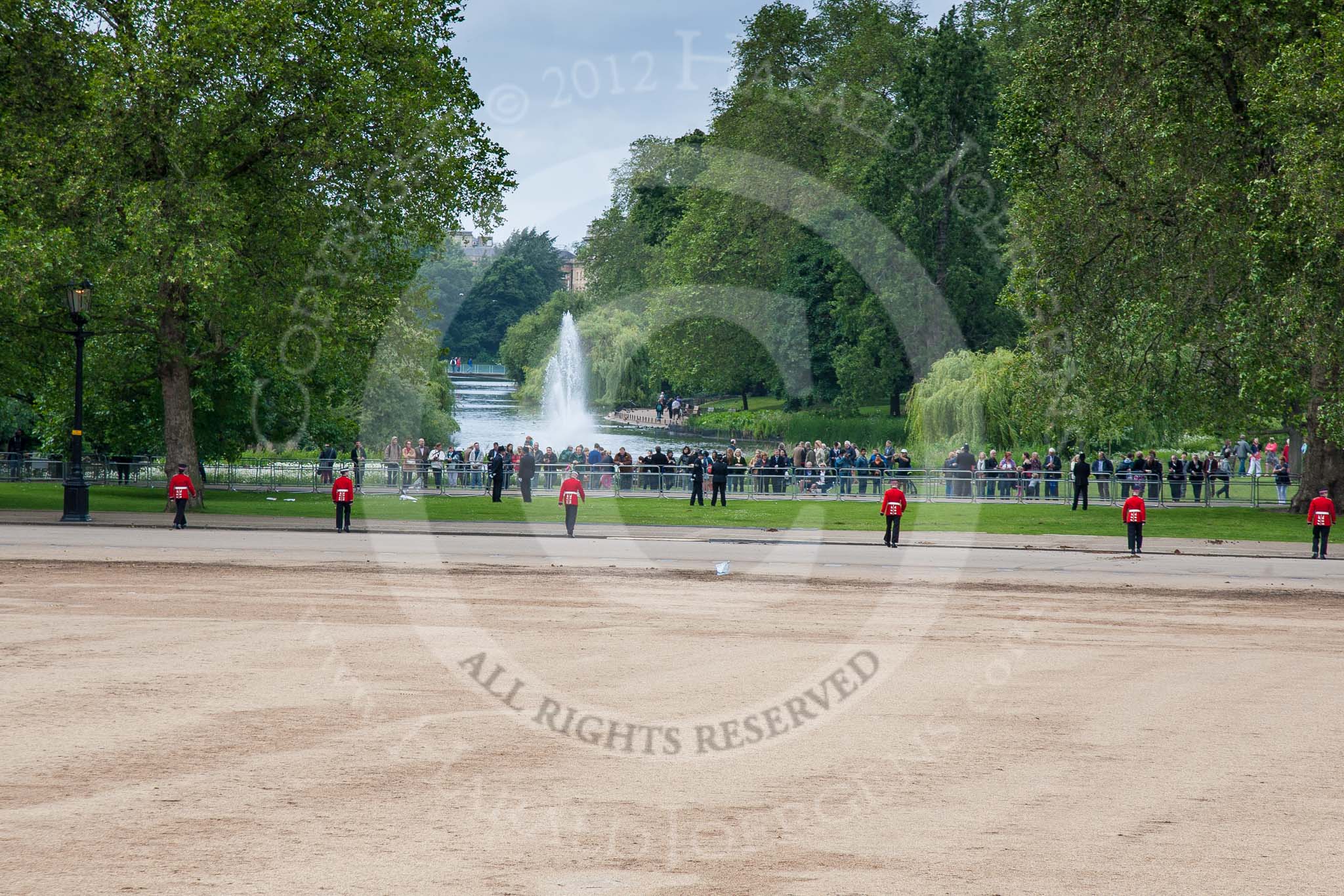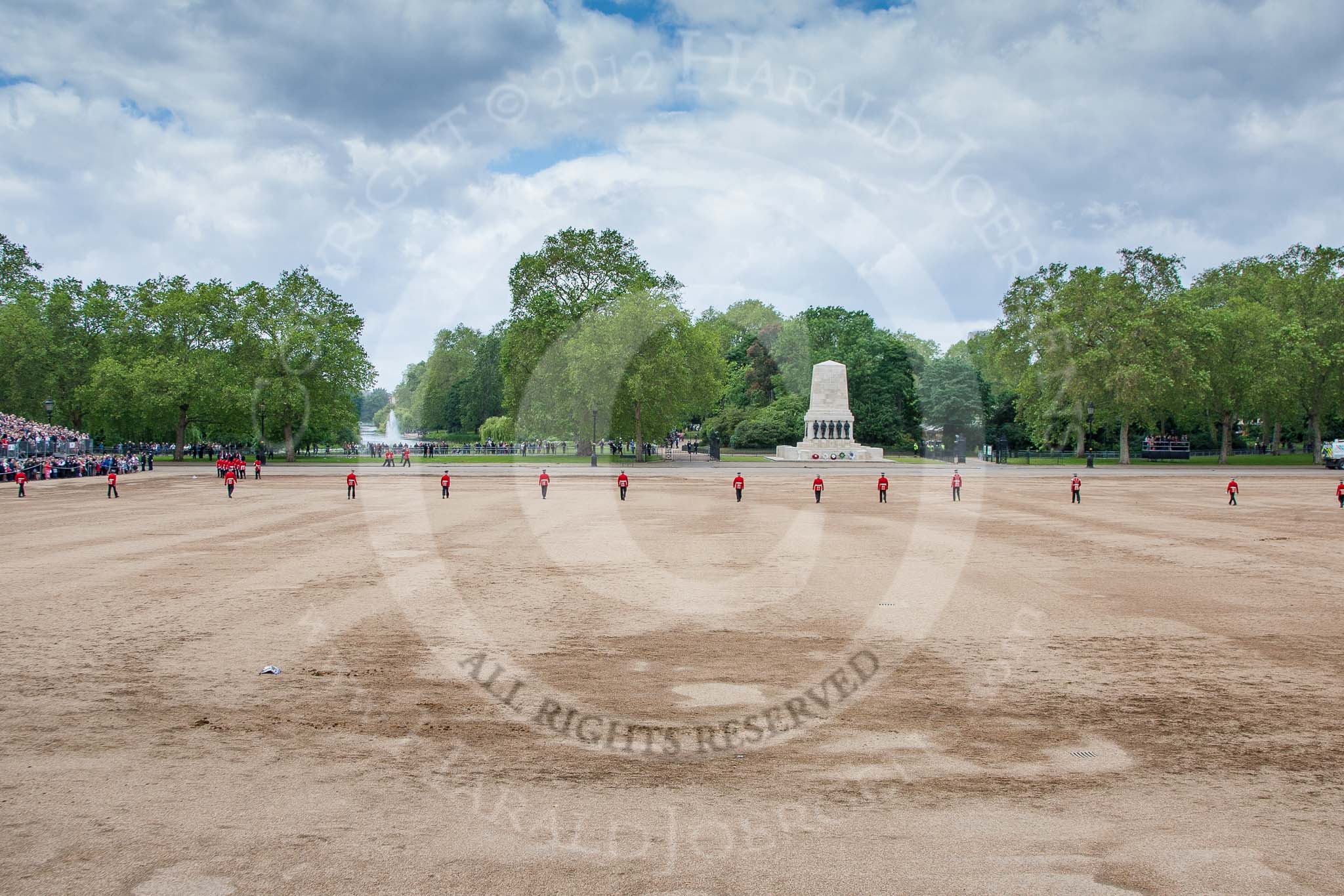 Trooping the Colour 2012: After the parade -Horse Guards Parade is checked before the spectators can leave. In the background the water feature in St. James's Park, behind it Buckingham Palace.. Horse Guards Parade, Westminster, London SW1, United Kingdom, on 16 June 2012 at 12:18, image #702