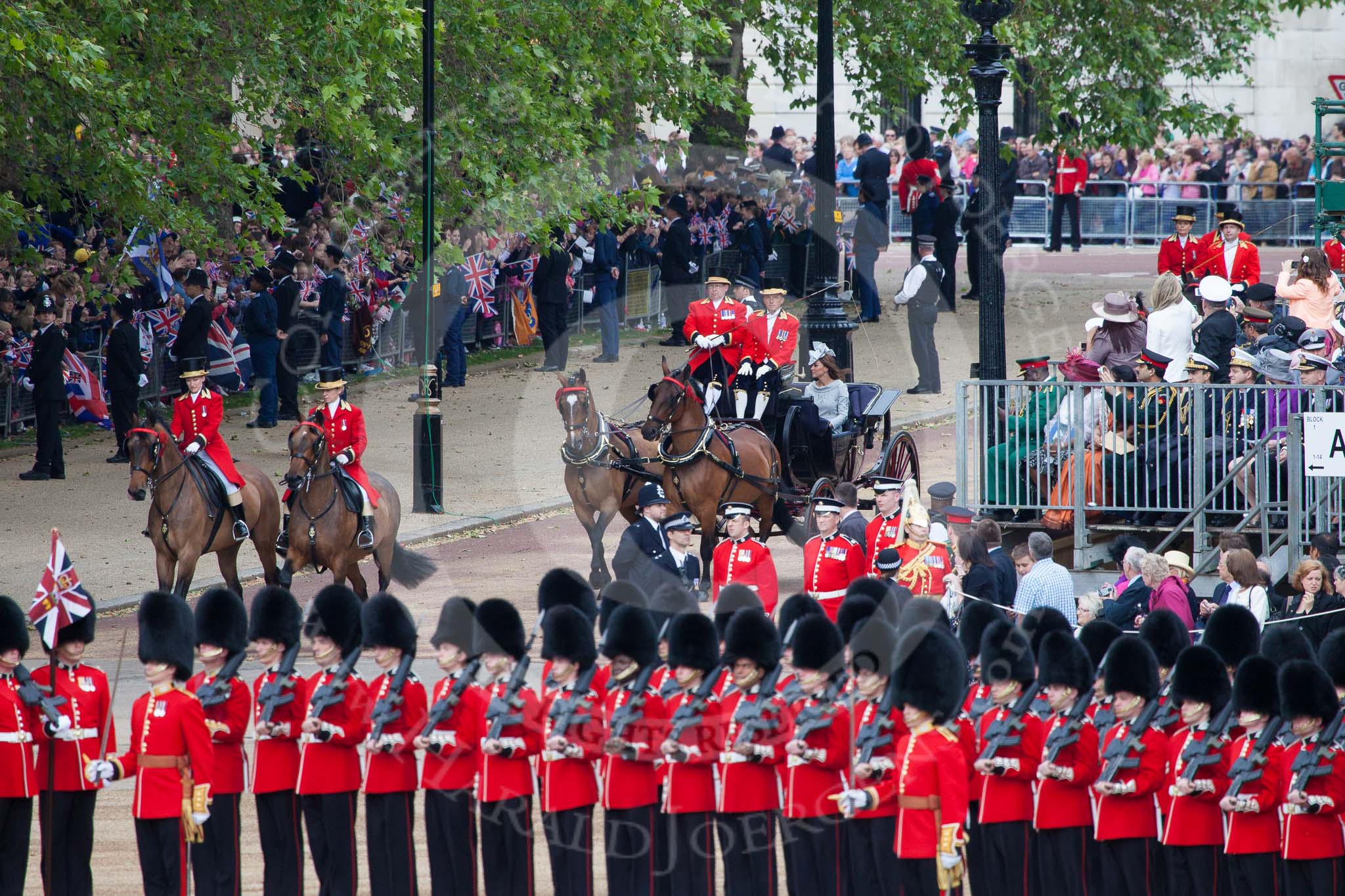 Trooping the Colour 2012: The first carriage coming down the approach road from the Mall, carrying The Duchess of Cambridge, the Duchess of Cornwall, and Prince Harry.. Horse Guards Parade, Westminster, London SW1, United Kingdom, on 16 June 2012 at 10:49, image #112