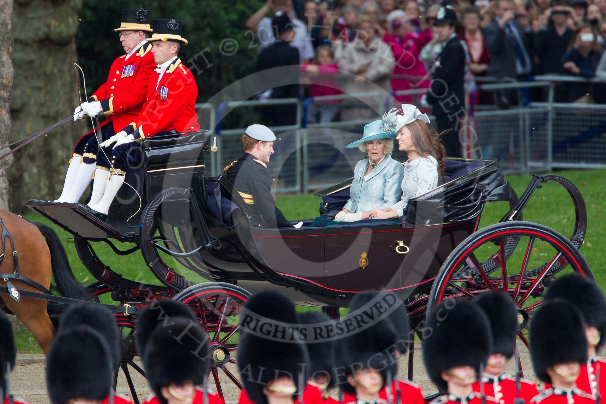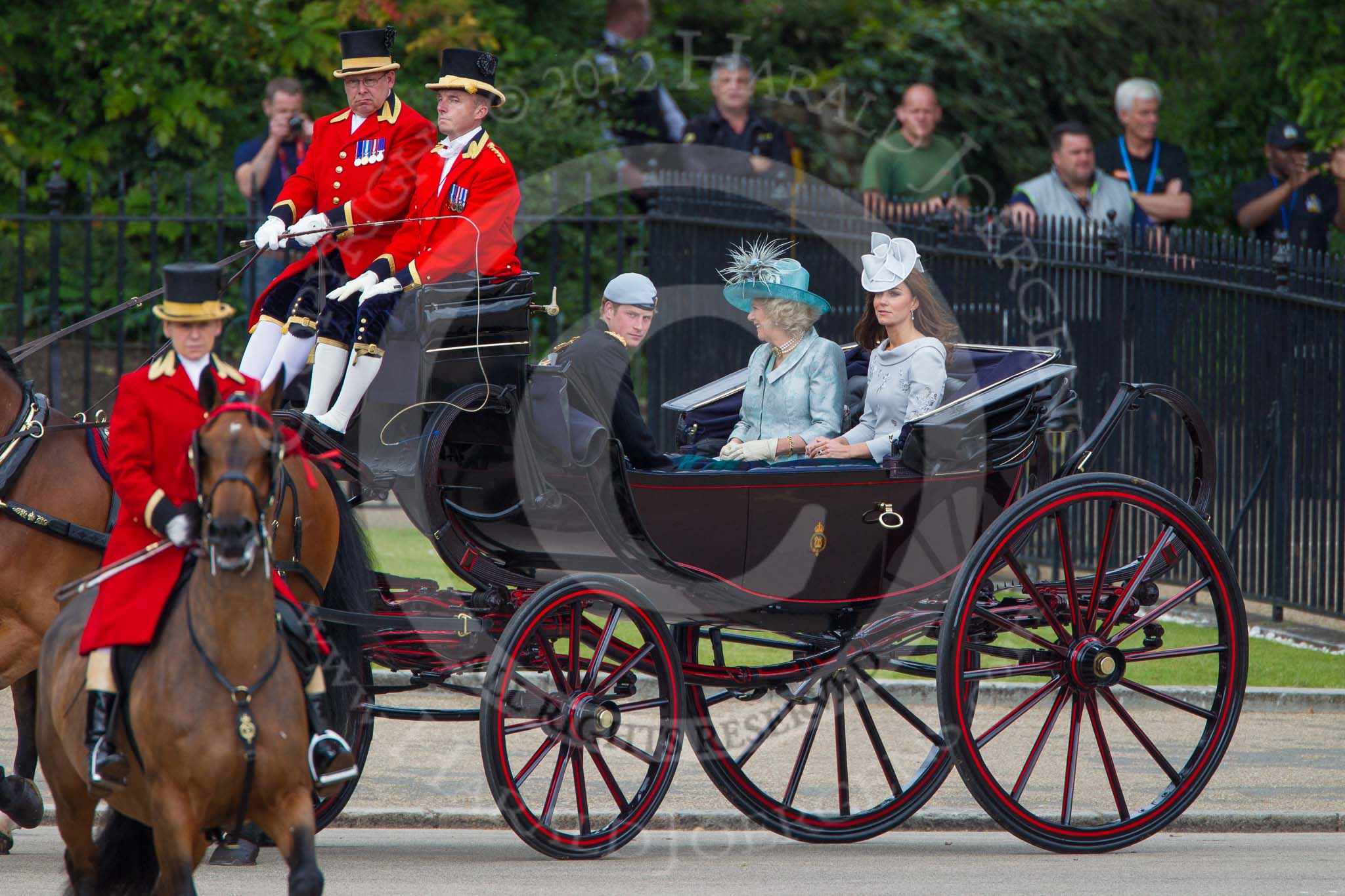 Trooping the Colour 2012: Prince Harry, the Ducess of Cornwall, and the Duchess of Cambridge in the first carriage.. Horse Guards Parade, Westminster, London SW1, United Kingdom, on 16 June 2012 at 10:50, image #117