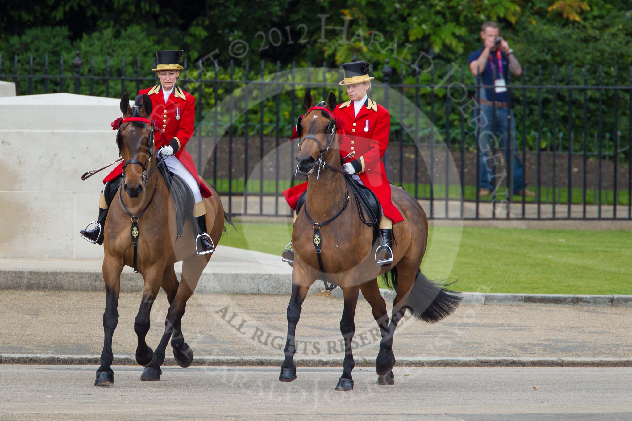 Trooping the Colour 2012: Two outriders (female liveried grooms from the Royal Mews) leading the first group of carriages.. Horse Guards Parade, Westminster, London SW1, United Kingdom, on 16 June 2012 at 10:50, image #116