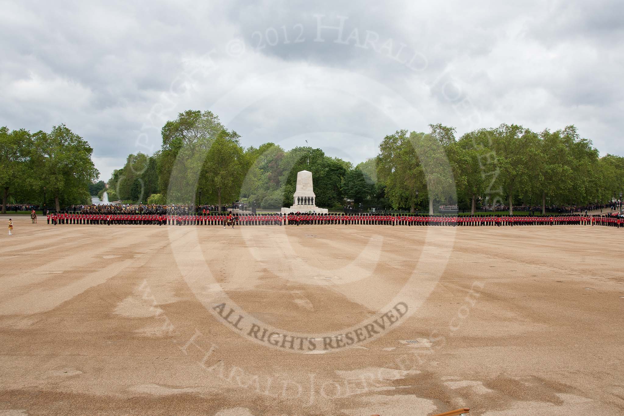 Trooping the Colour 2012: No. 3 Guard has closed the gap in the line again, after the two carriages with members of the Royal Family have passed..