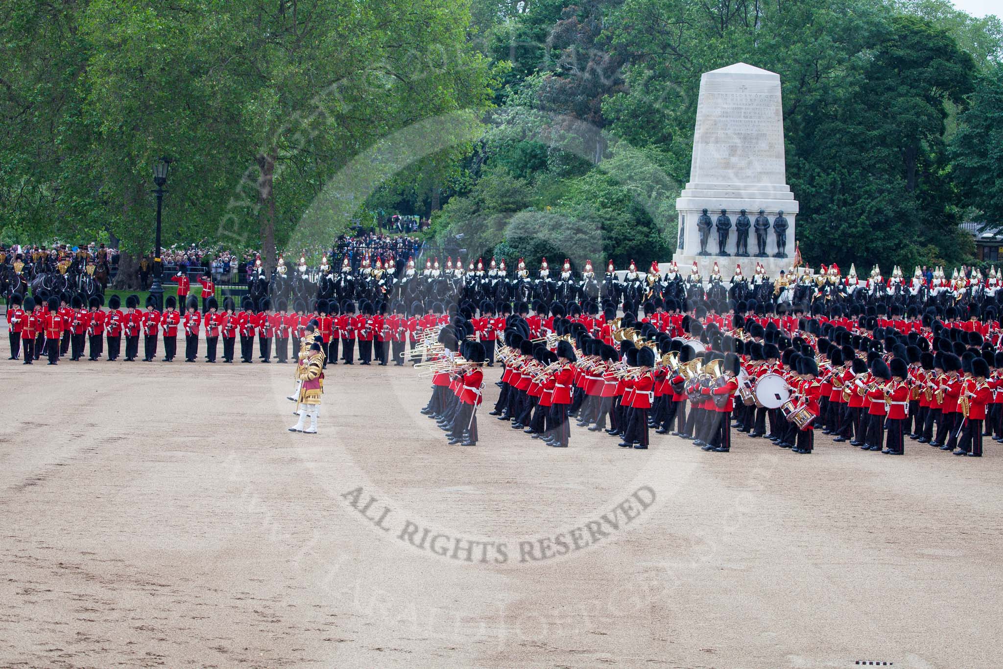 Trooping the Colour 2012: The Massed Bands are marchin towards the left hand side of Horse Guards Parade, whilst the Colour is beinf trooped along No. 6 Guard on the right hand side of the parade ground..