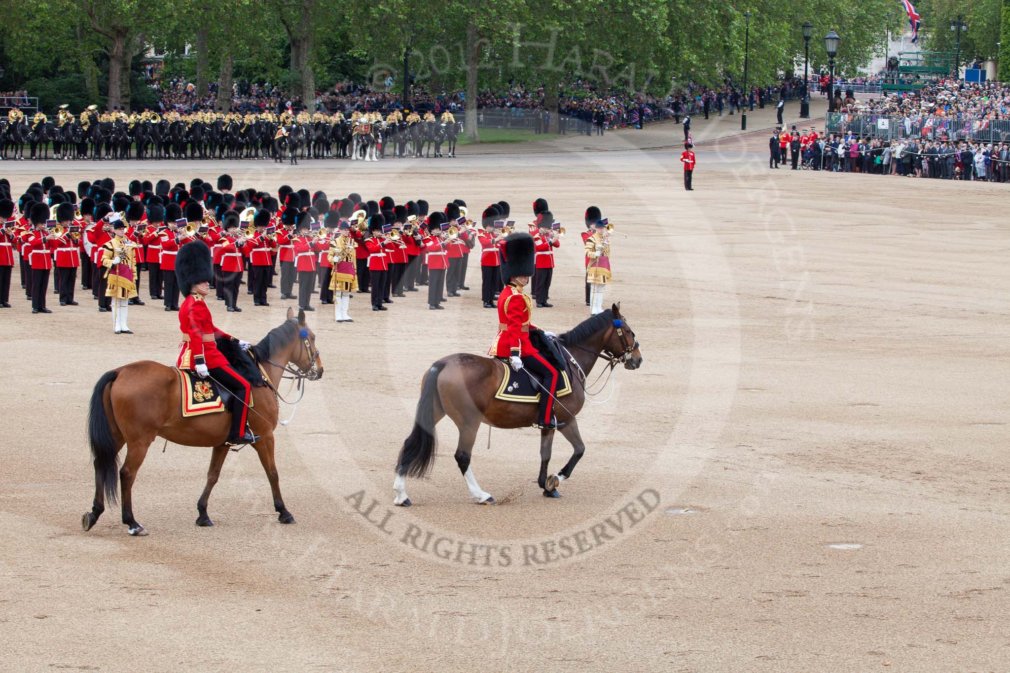 Trooping the Colour 2012: Riding past Her Majesty - the Major of the Parade, Major Mark Lewis, Welsh Guards, and the Field Officer, Lieutenant Colonel R C N Sergeant, Coldstream Guards, during the March Past..