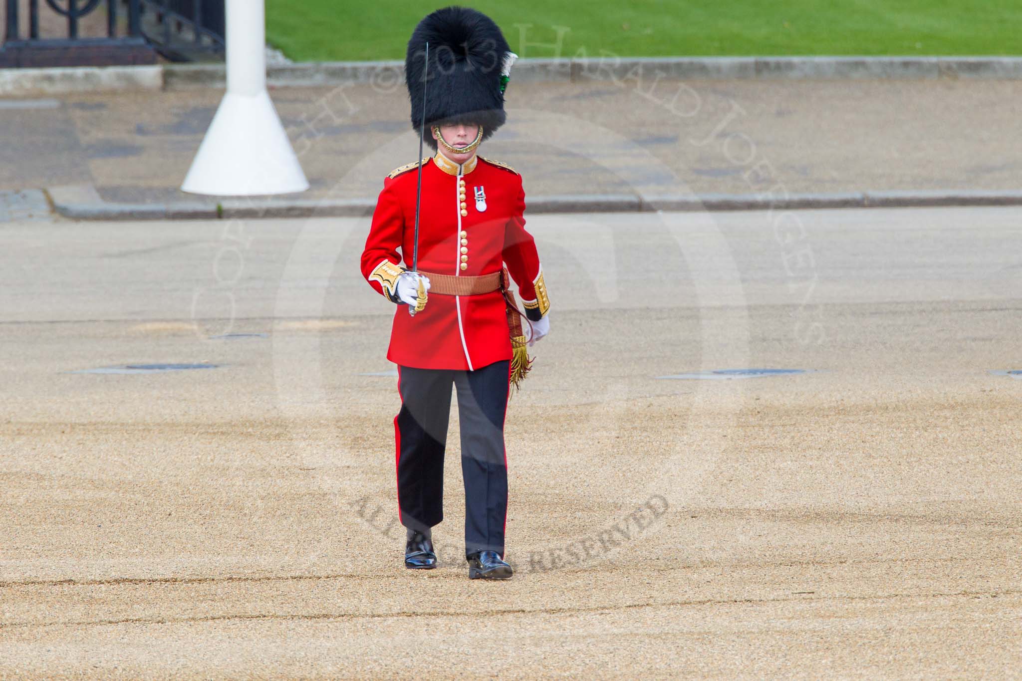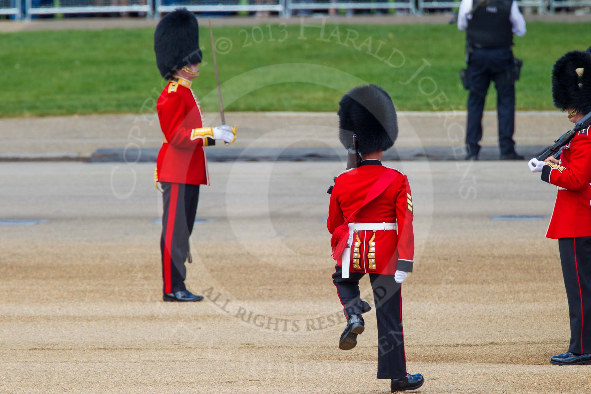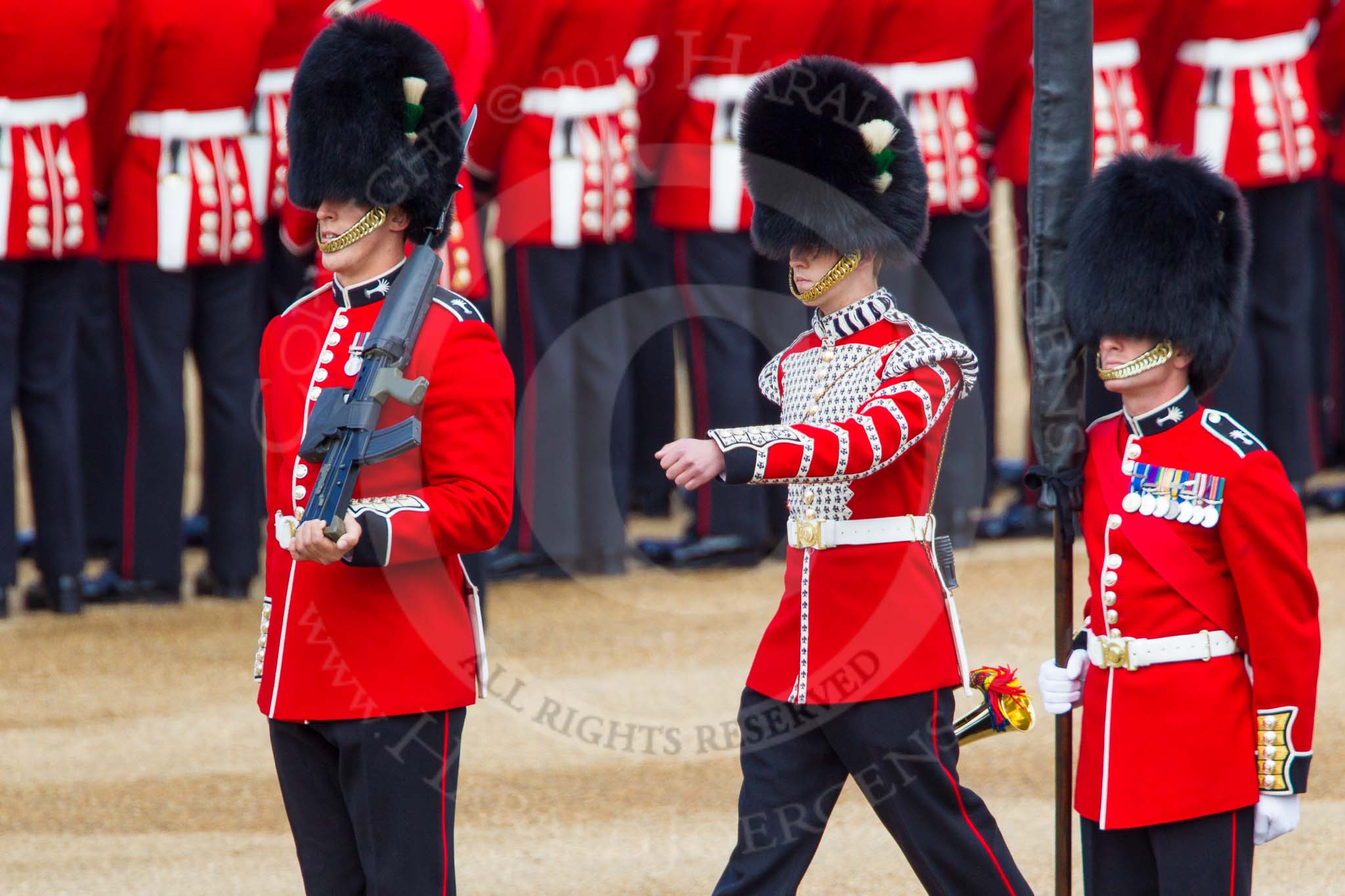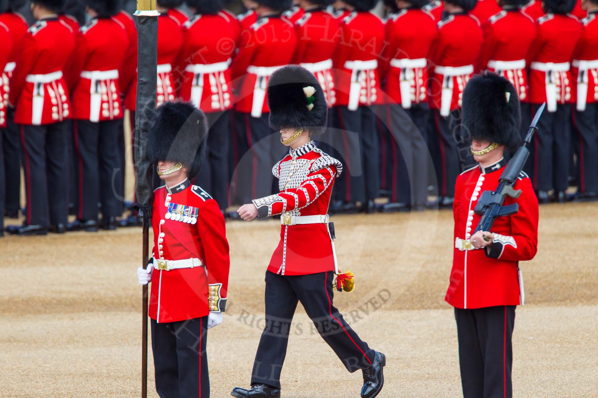 The Colonel's Review 2013: Welsh Guards Drummer approaching Colour Sergeant R J Heath, Welsh Guards, carrying the Colour and the two sentries..