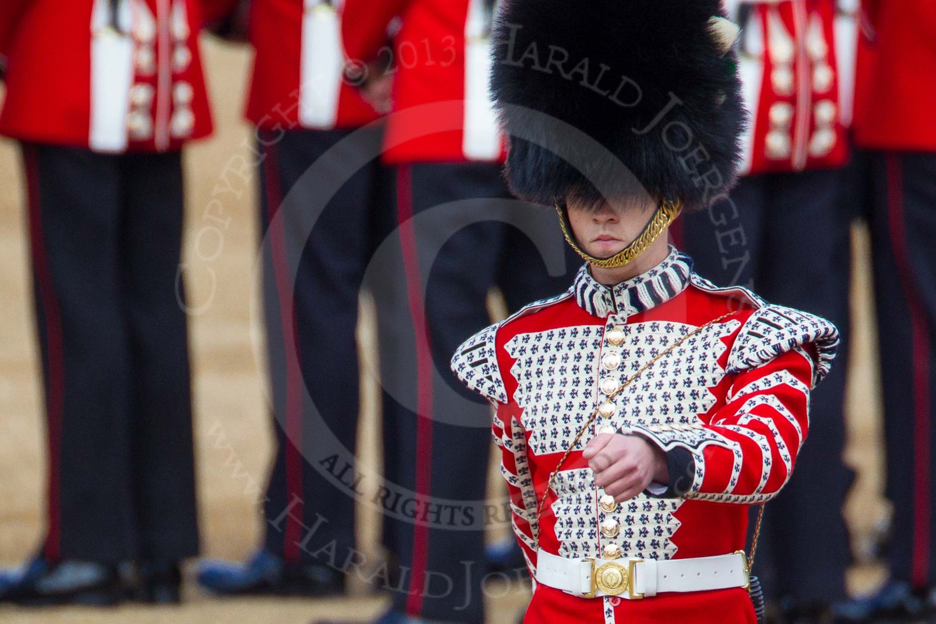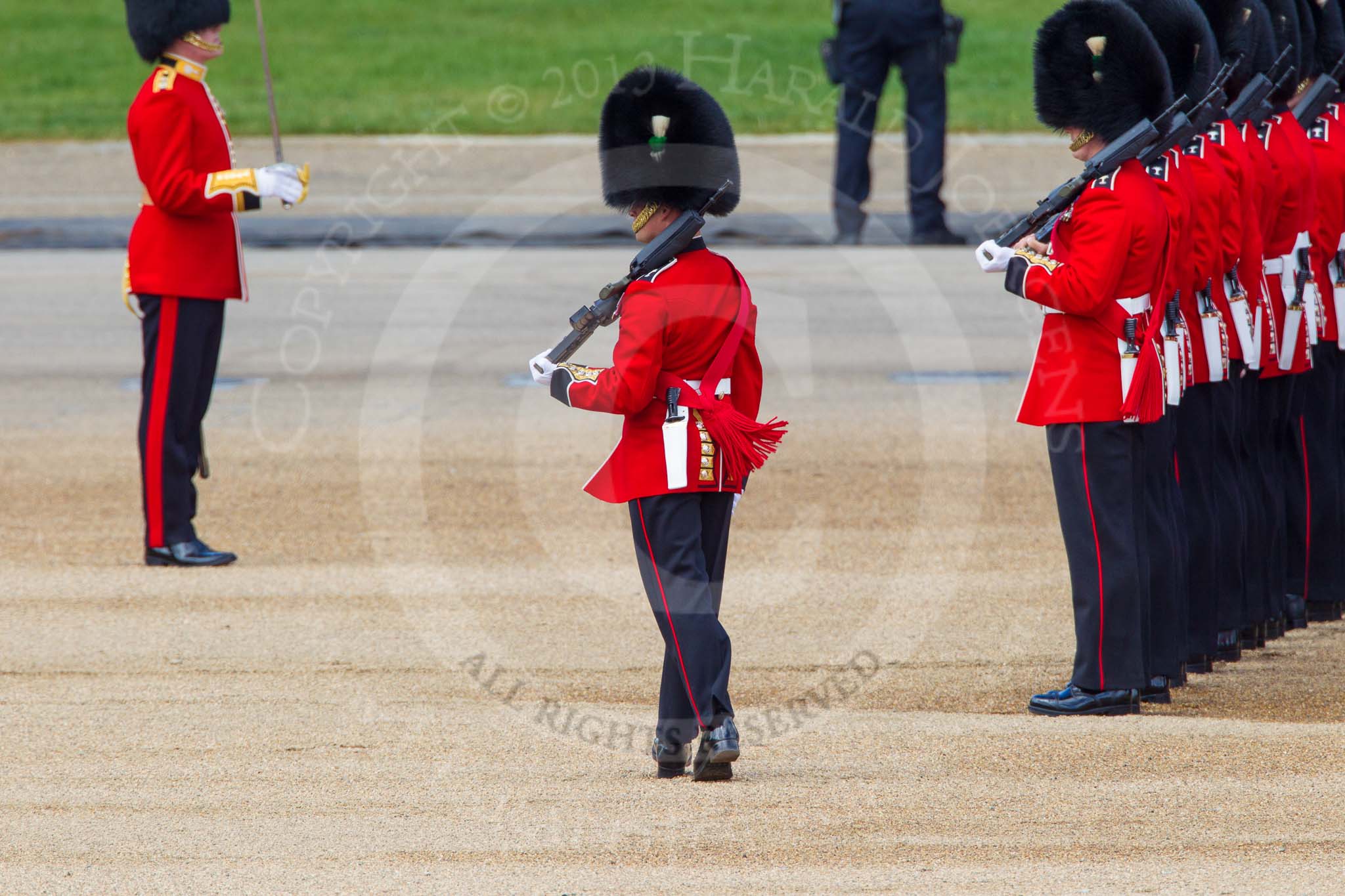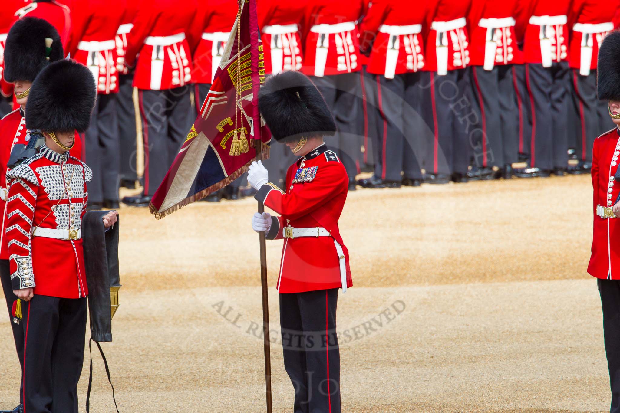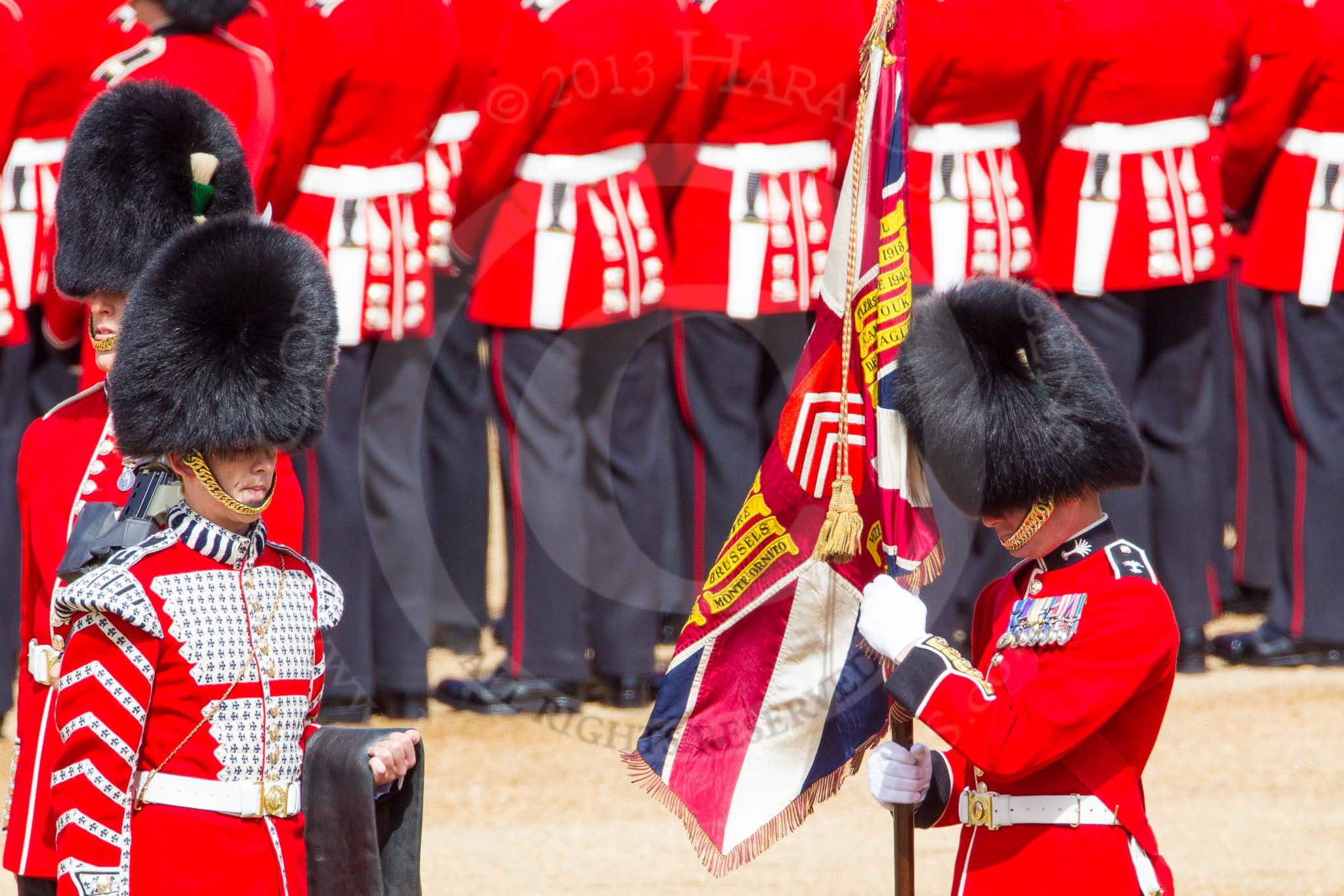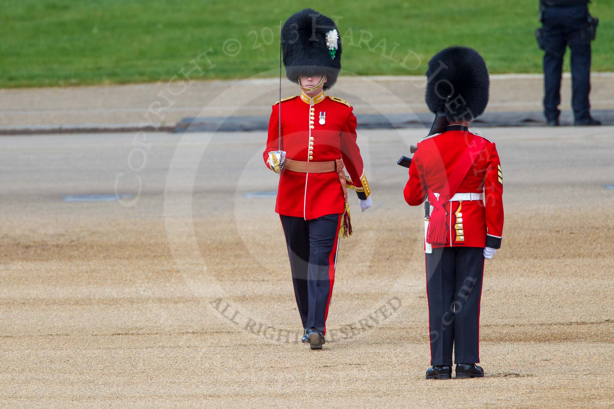 The Colonel's Review 2013: Welsh Guards Drummer approaching Colour Sergeant R J Heath, Welsh Guards, carrying the Colour and the two sentries..