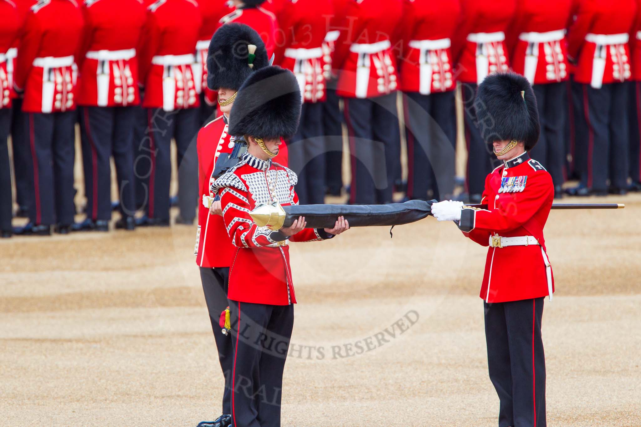 The Colonel's Review 2013: Colour Sergeant R J Heath, Welsh Guards, removing the Colour case..