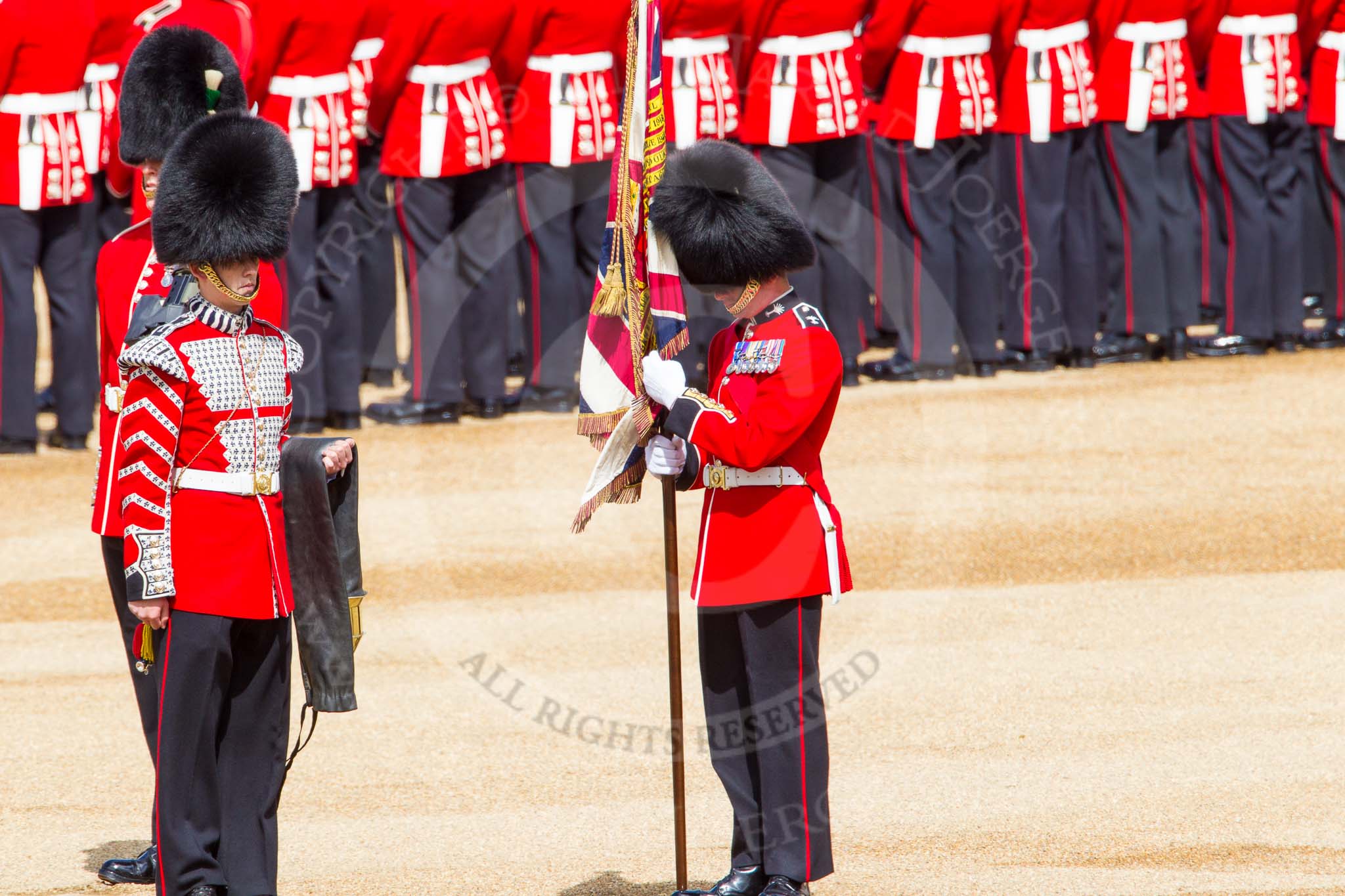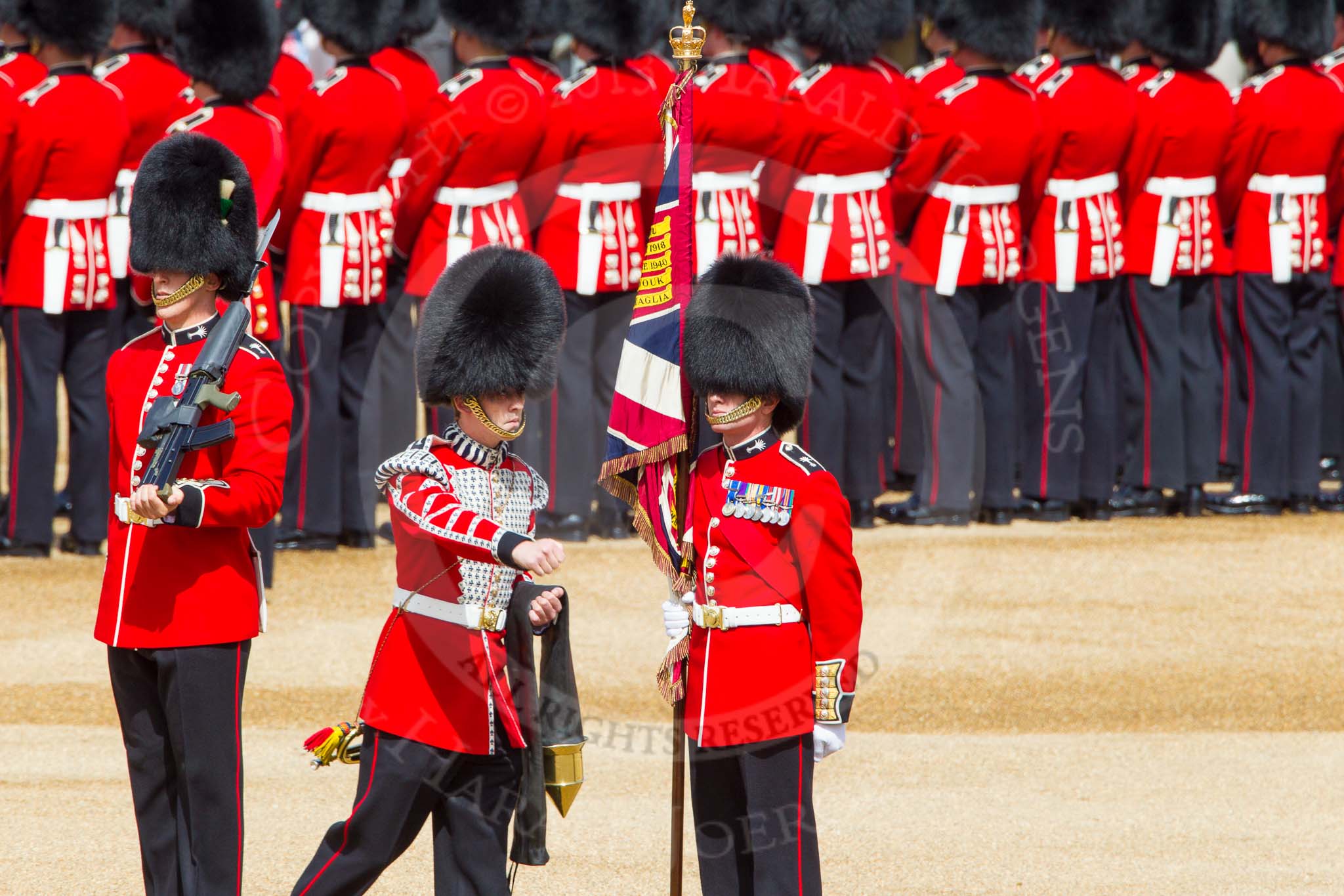 The Colonel's Review 2013: The Colour is now uncased, and the two sentries patrol to the left and right, to protect the Colour.. Horse Guards Parade, Westminster, London SW1, United Kingdom, on 08 June 2013 at 10:34, image #160