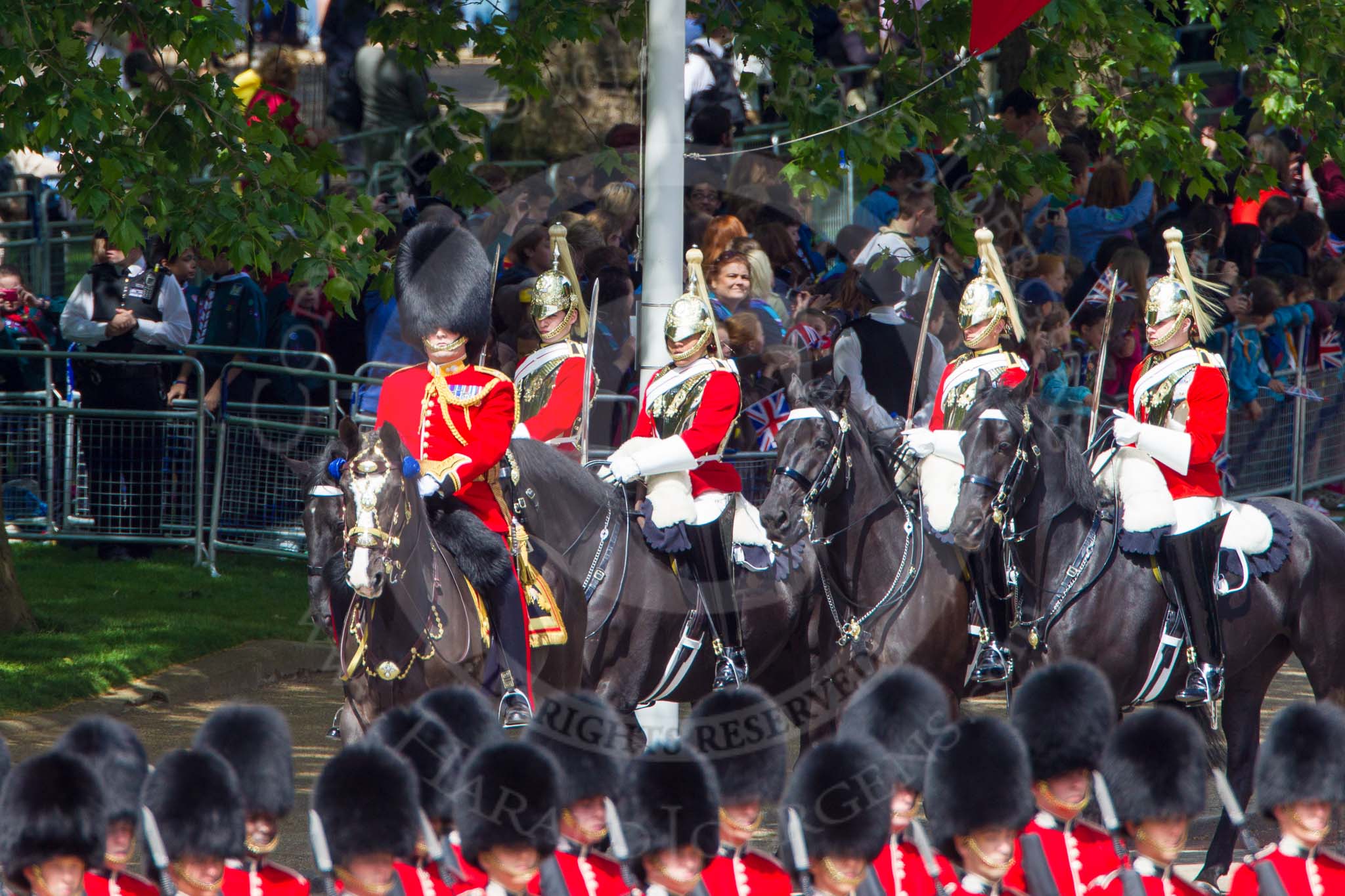 The Colonel's Review 2013: Leading the Royal Procession from The Mall onto Horse Guards Parade - Brigade Major Household Division Lieutenant Colonel Simon Soskin, Grenadier Guards, followed by four Troopers of The Life Guards.. Horse Guards Parade, Westminster, London SW1, United Kingdom, on 08 June 2013 at 10:55, image #241