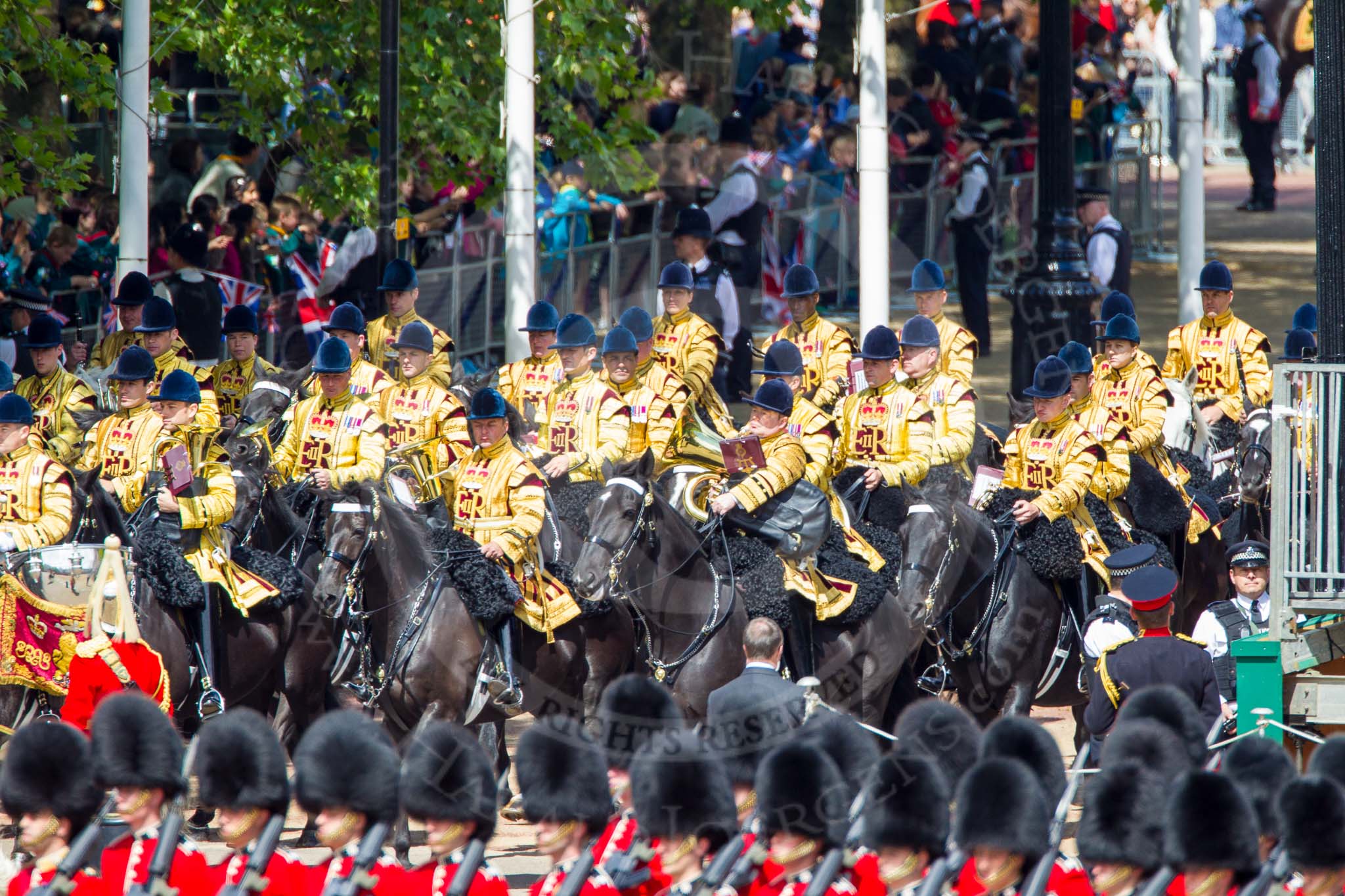 The Colonel's Review 2013: The Mounted Bands of the Household Cavalry are marching down Horse Guards Road as the third element of the Royal Procession.. Horse Guards Parade, Westminster, London SW1, United Kingdom, on 08 June 2013 at 10:57, image #250
