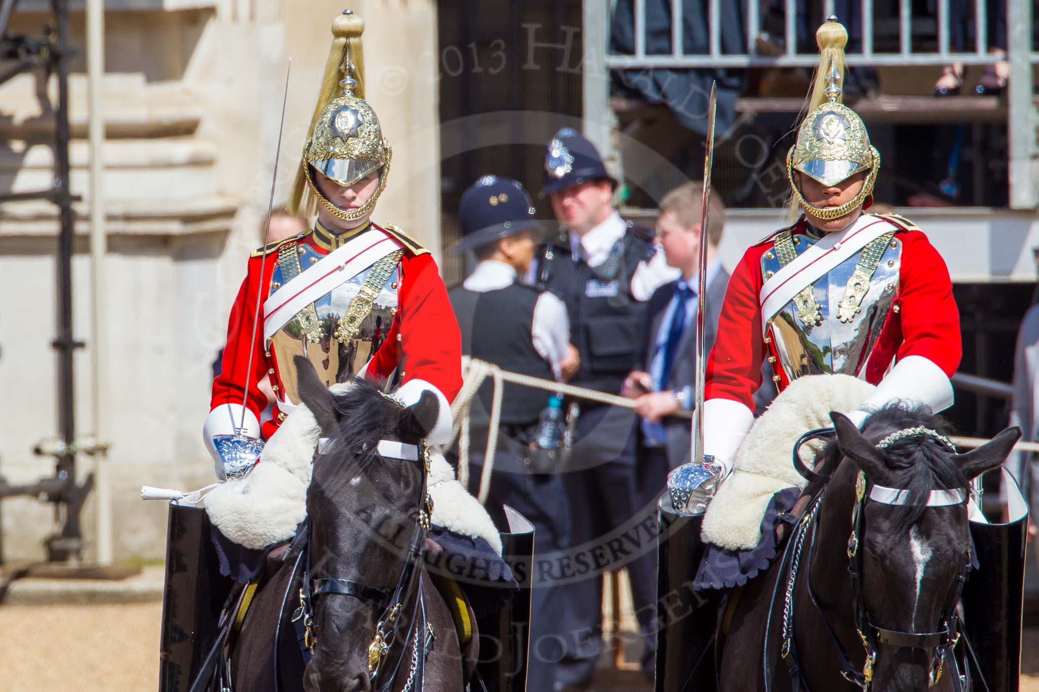 The Colonel's Review 2013: The Two Troopers of The Life Guards, following the Brigade Major at the head of the Royal Procession.. Horse Guards Parade, Westminster, London SW1, United Kingdom, on 08 June 2013 at 10:57, image #253