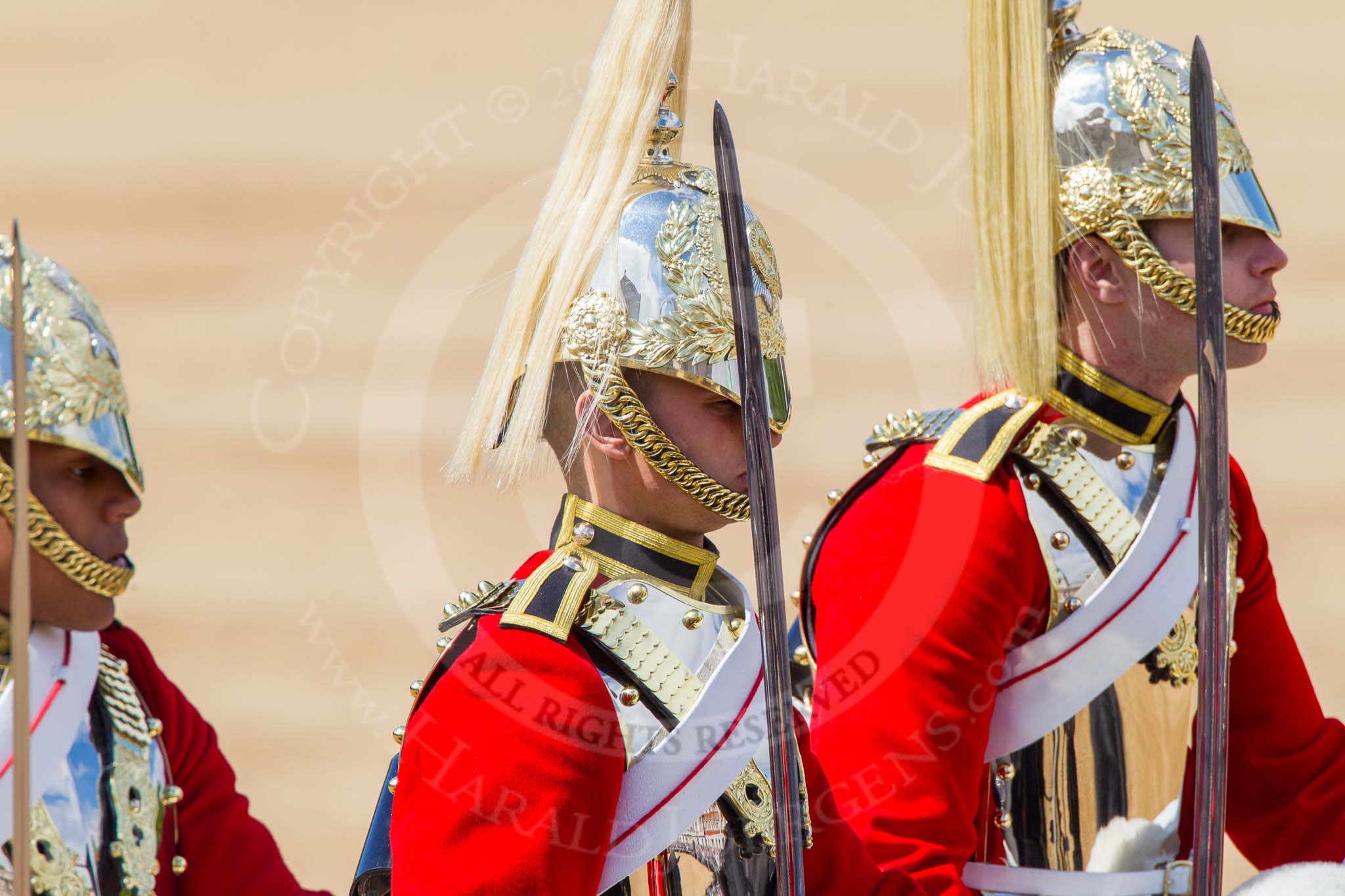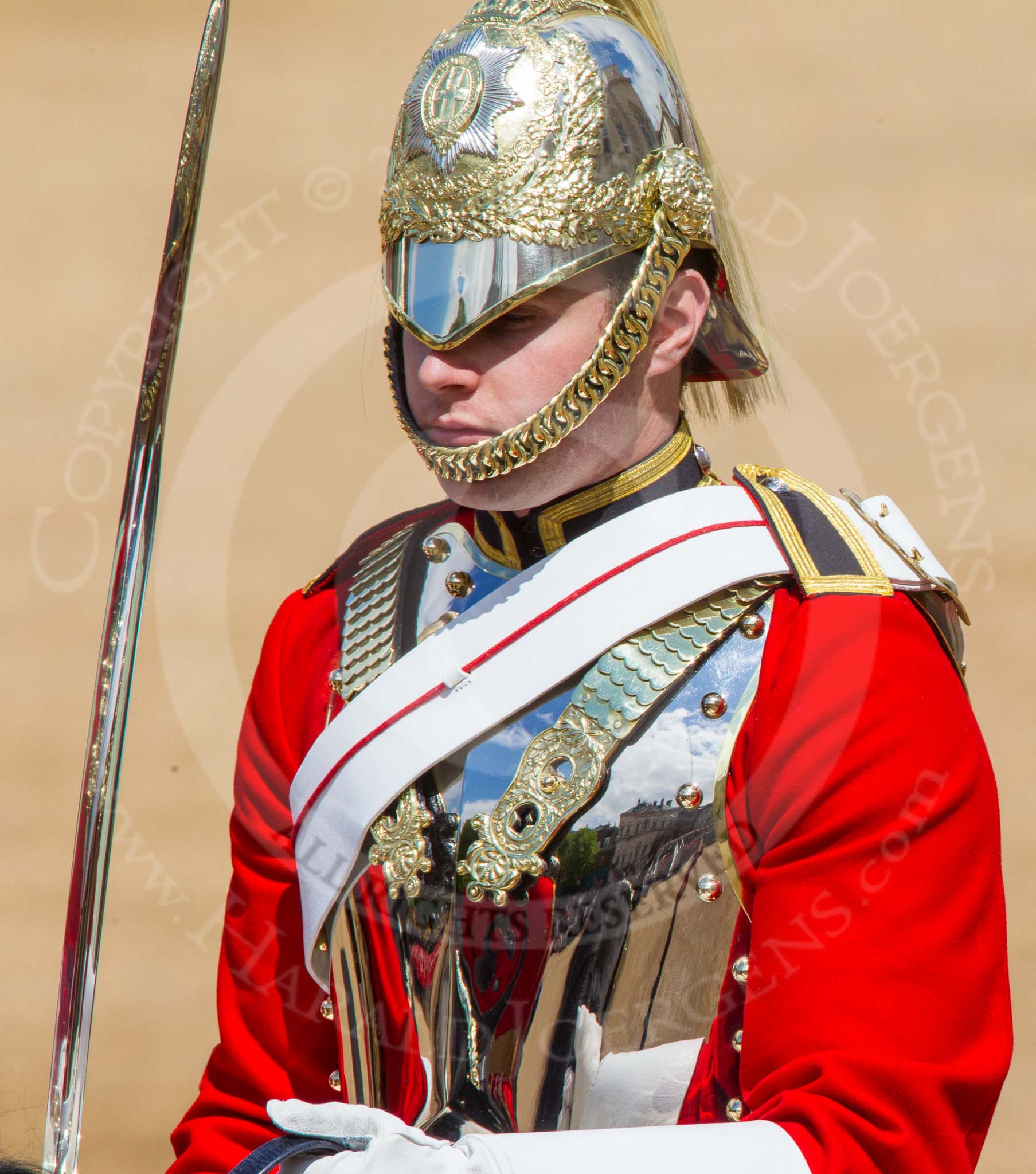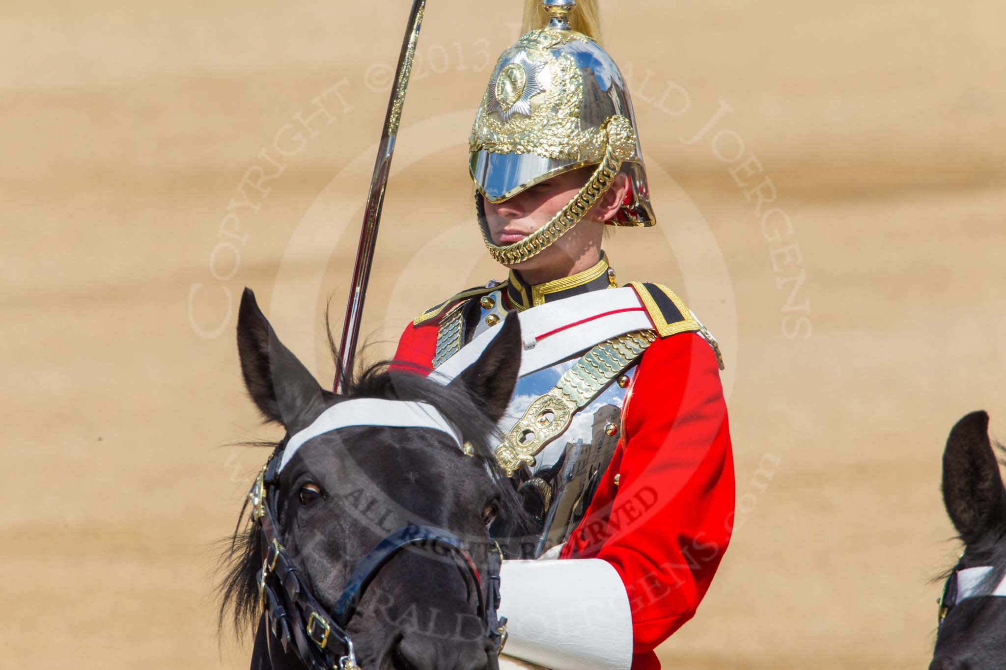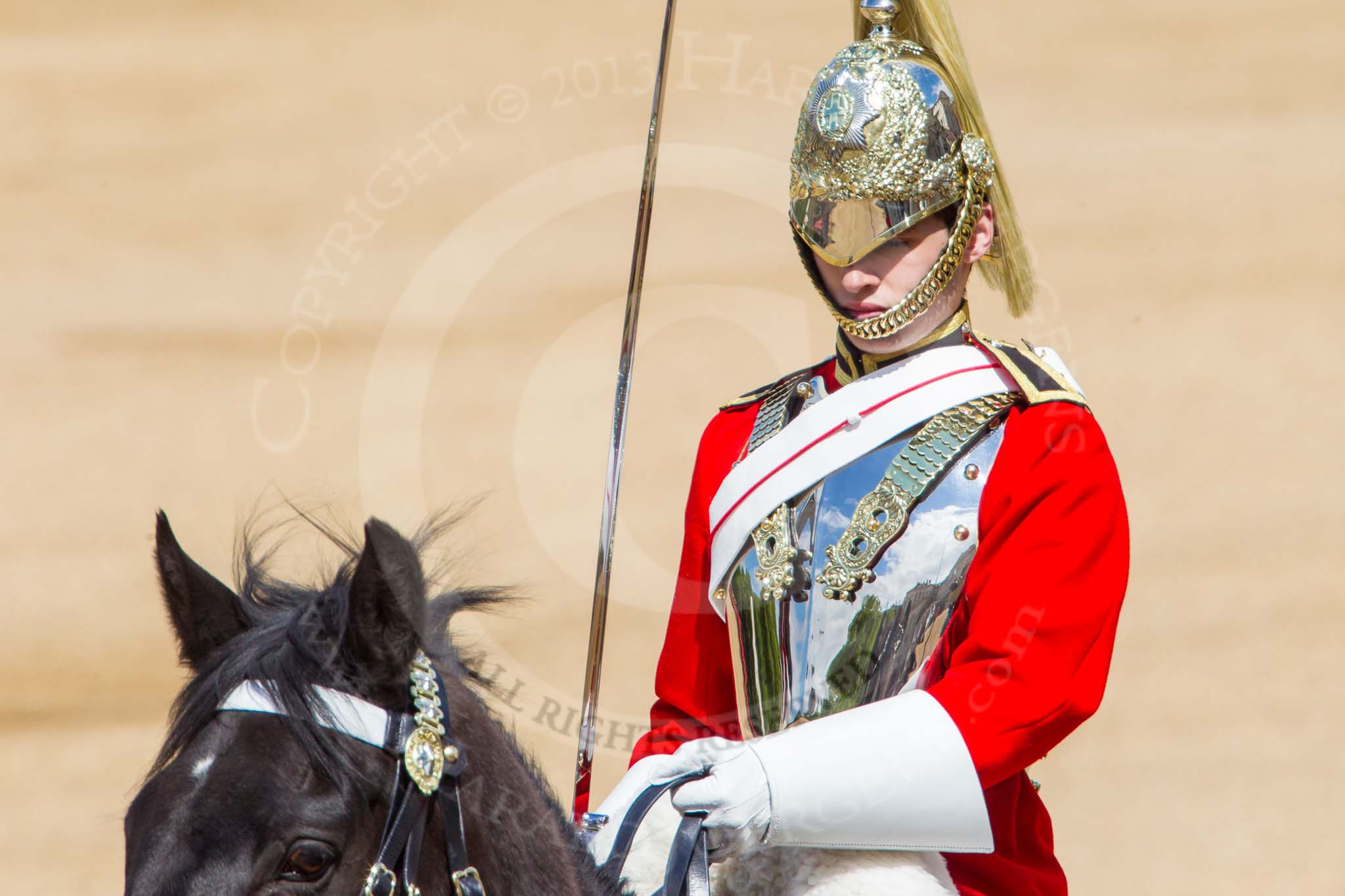 The Colonel's Review 2013: Detail shot of the helmet of one of the Life Guard Troopers following the Brigade Major.. Horse Guards Parade, Westminster, London SW1, United Kingdom, on 08 June 2013 at 10:58, image #264