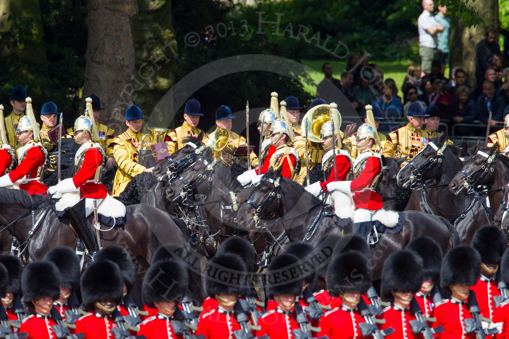 The Colonel's Review 2013: First and Second Division of the Sovereign's Escort, The Life Guards, here riding down Horse Guards Road passing The Mounted Bands of the Household Cavalry and No.5 Guard F Company Scots Guards.. Horse Guards Parade, Westminster, London SW1, United Kingdom, on 08 June 2013 at 10:58, image #266