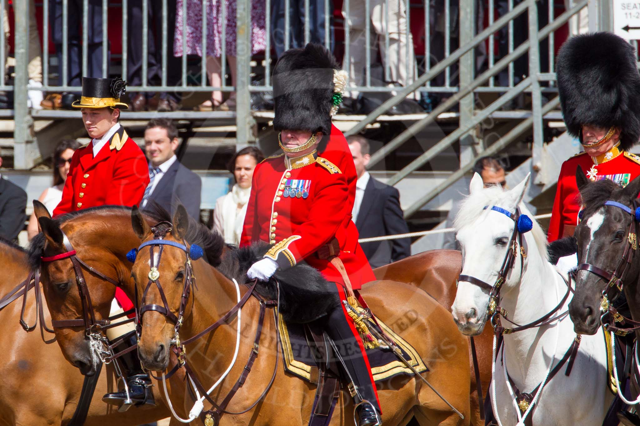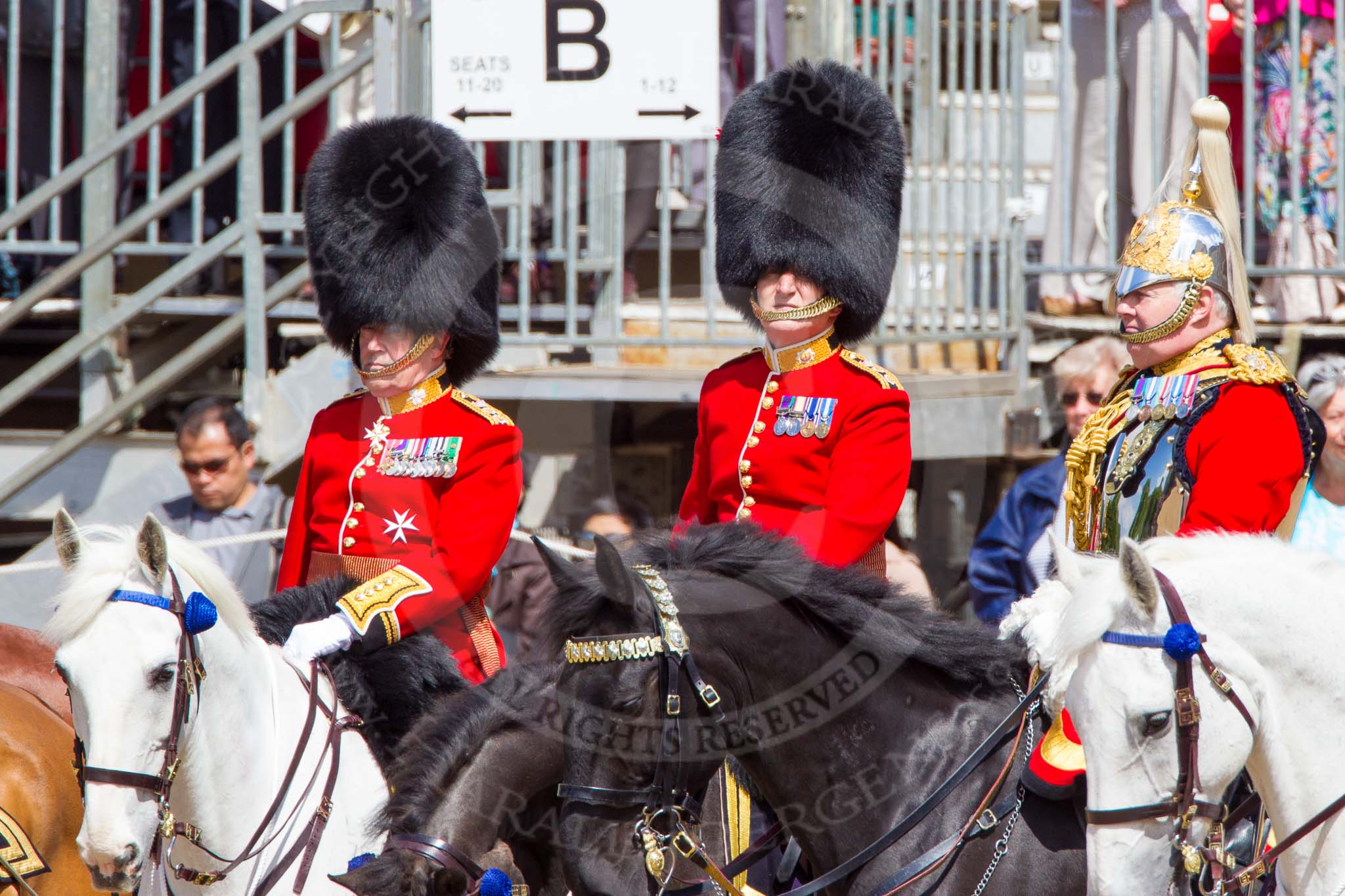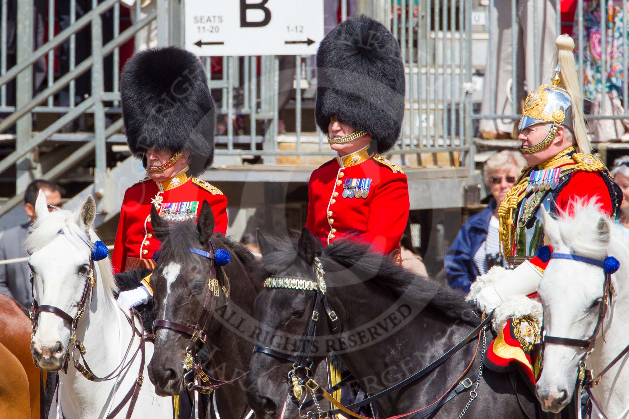 The Colonel's Review 2013: From left to right-The Foot Guards Regimental Adjutants - Colonel T C R B Purdon, Irish Guards, Colonel D D S A Vandeleur, Coldstream Guards, The Silver Stick Adjutant and Foot Guards Regimental Adjutants - Lieutenant Colonel H S J Scott, The Life Guards.. Horse Guards Parade, Westminster, London SW1, United Kingdom, on 08 June 2013 at 11:00, image #303