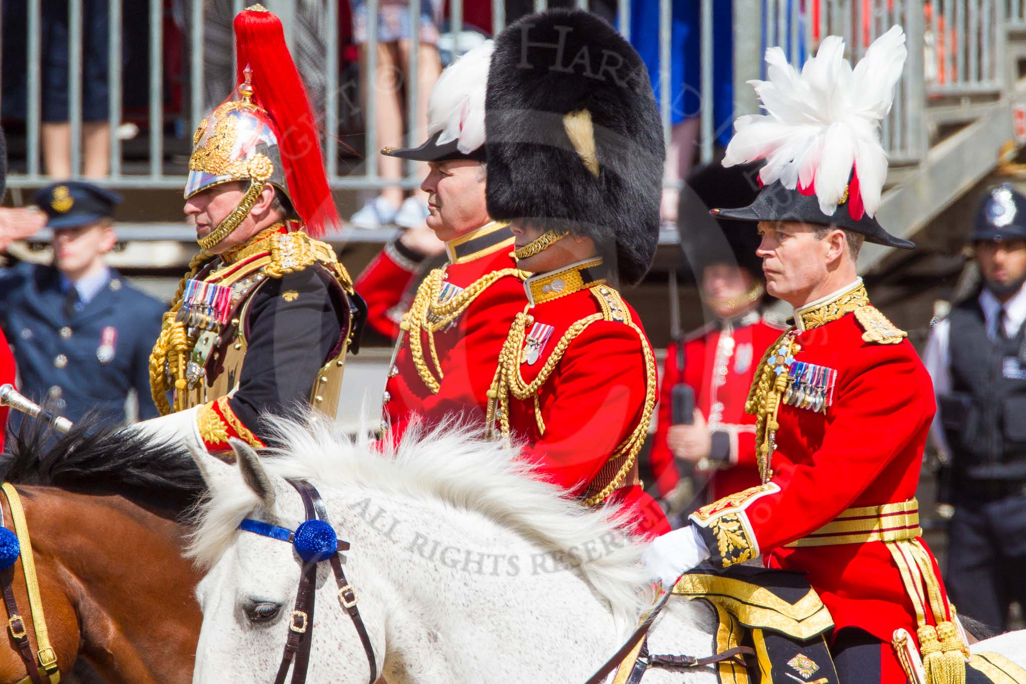 The Colonel's Review 2013: From left to right - Foot Guards Regimental Adjutant Lieutenant Colonel A W Foster, Silver-Stick-in-Waiting, Colonel S H Cowen, The Blues and Royals, Chief of Staff, Colonel R H W St G Bodington, Welsh Guards, Aide-de-Camp, Captain J J Hathaway-White, Grenadier Guards and The Major General Commanding the Household Division and General Officer Commanding London District, Major G P R Norton.. Horse Guards Parade, Westminster, London SW1, United Kingdom, on 08 June 2013 at 11:01, image #307