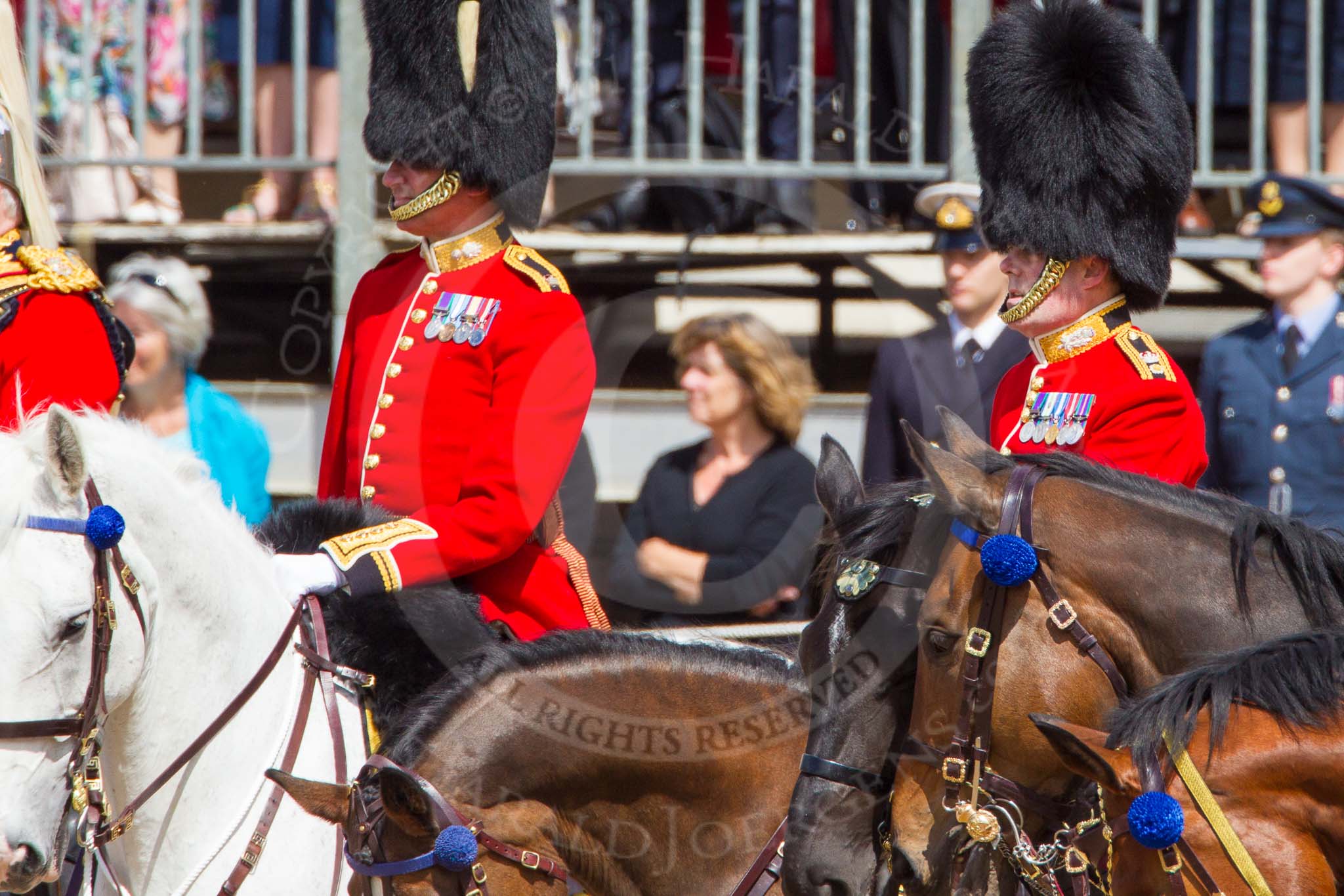 The Colonel's Review 2013: The Foot Guards Regimental Adjutants - Colonel T C R B Purdon, Irish Guards, Colonel, Colonel T C S Bonas, Welsh Guards.On the left Two Grooms, The Royal Household.. Horse Guards Parade, Westminster, London SW1, United Kingdom, on 08 June 2013 at 11:00, image #304