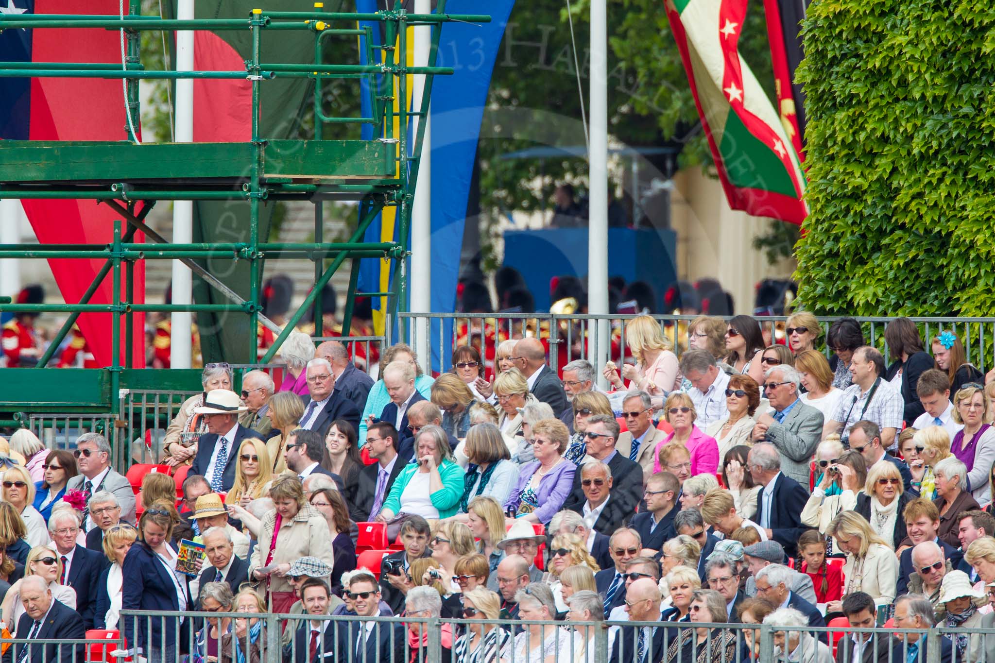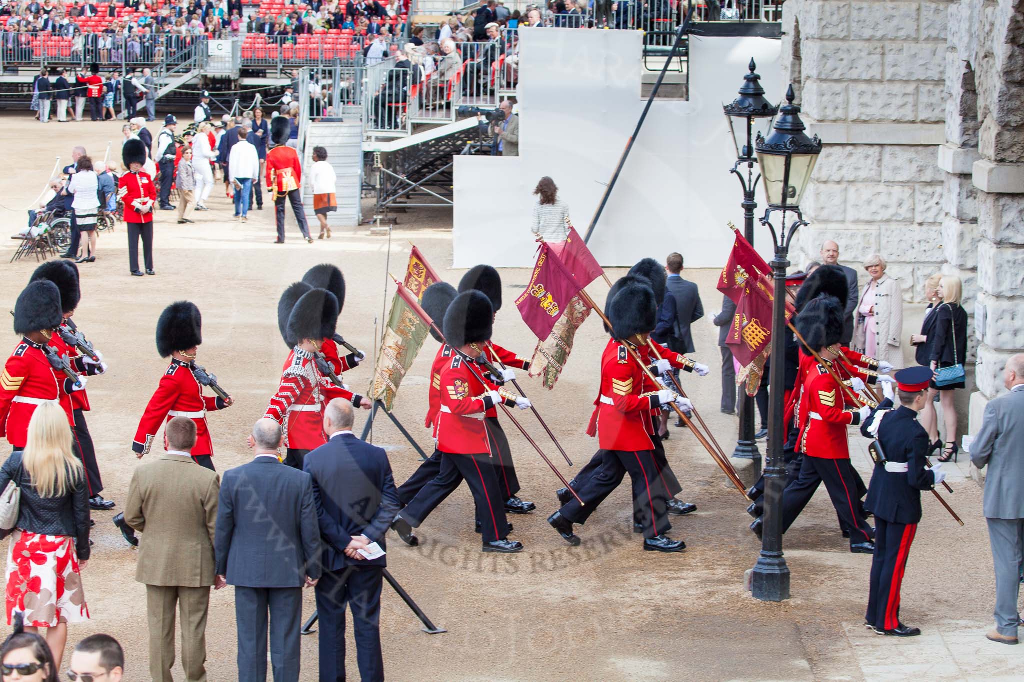 The Colonel's Review 2013: The 'Keepers of the Ground', guardsmen bearing marker flags for their respective regiments, disappearing under Horse Guards Arch, they will return later to mark the positions for their regiments..