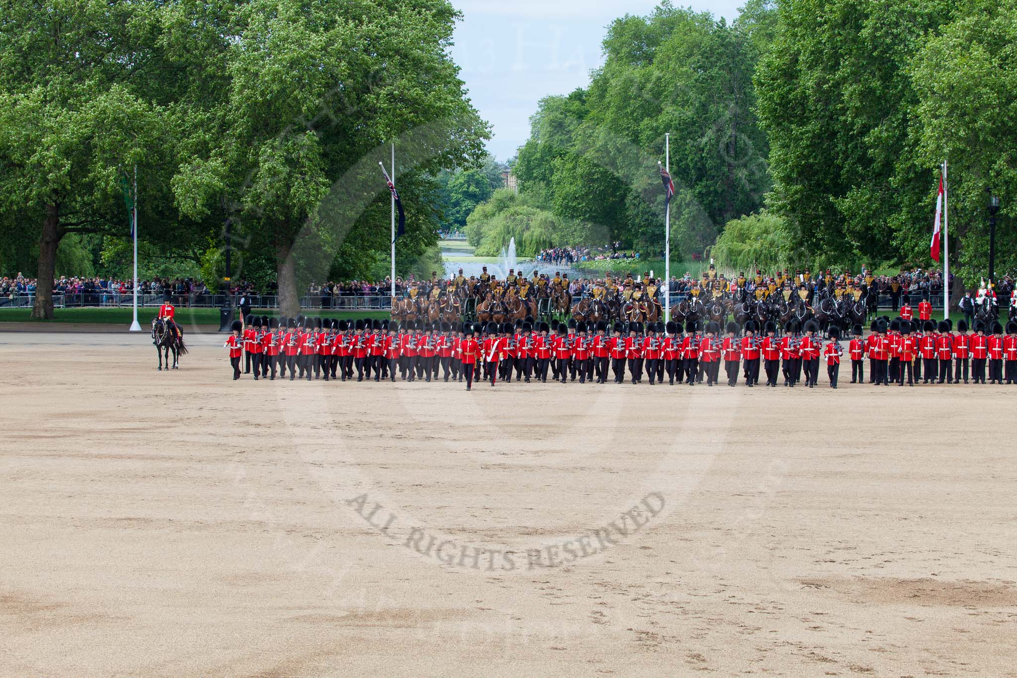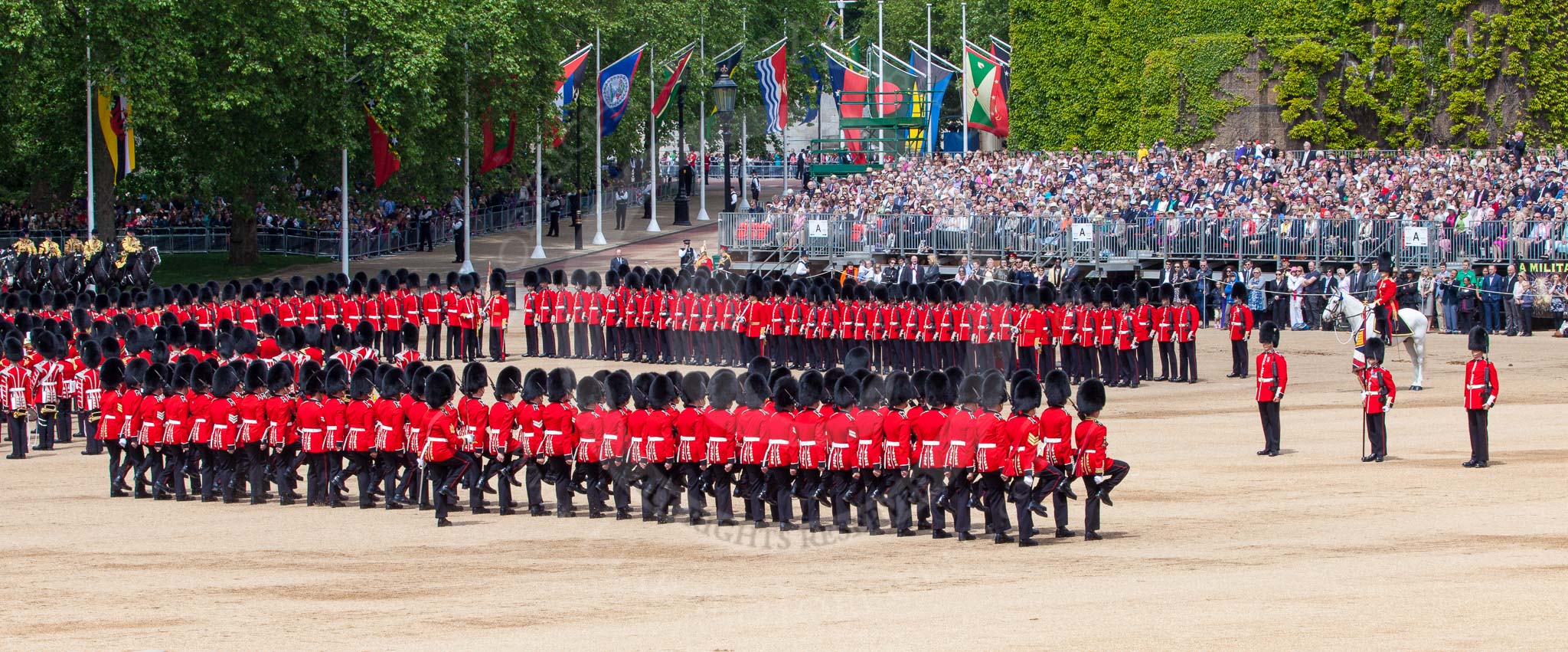 The Colonel's Review 2013: The men of No. 1 Guard (Escort for the Colour),1st Battalion Welsh Guards are moving into a new formation, facing the Coloir Party on the other side of Horse Guards Parade. In front the Ensign, Second Lieutenant Joel Dinwiddle, and the Subaltern, Captain F O Lloyd-George.. Horse Guards Parade, Westminster, London SW1, United Kingdom, on 08 June 2013 at 11:16, image #486