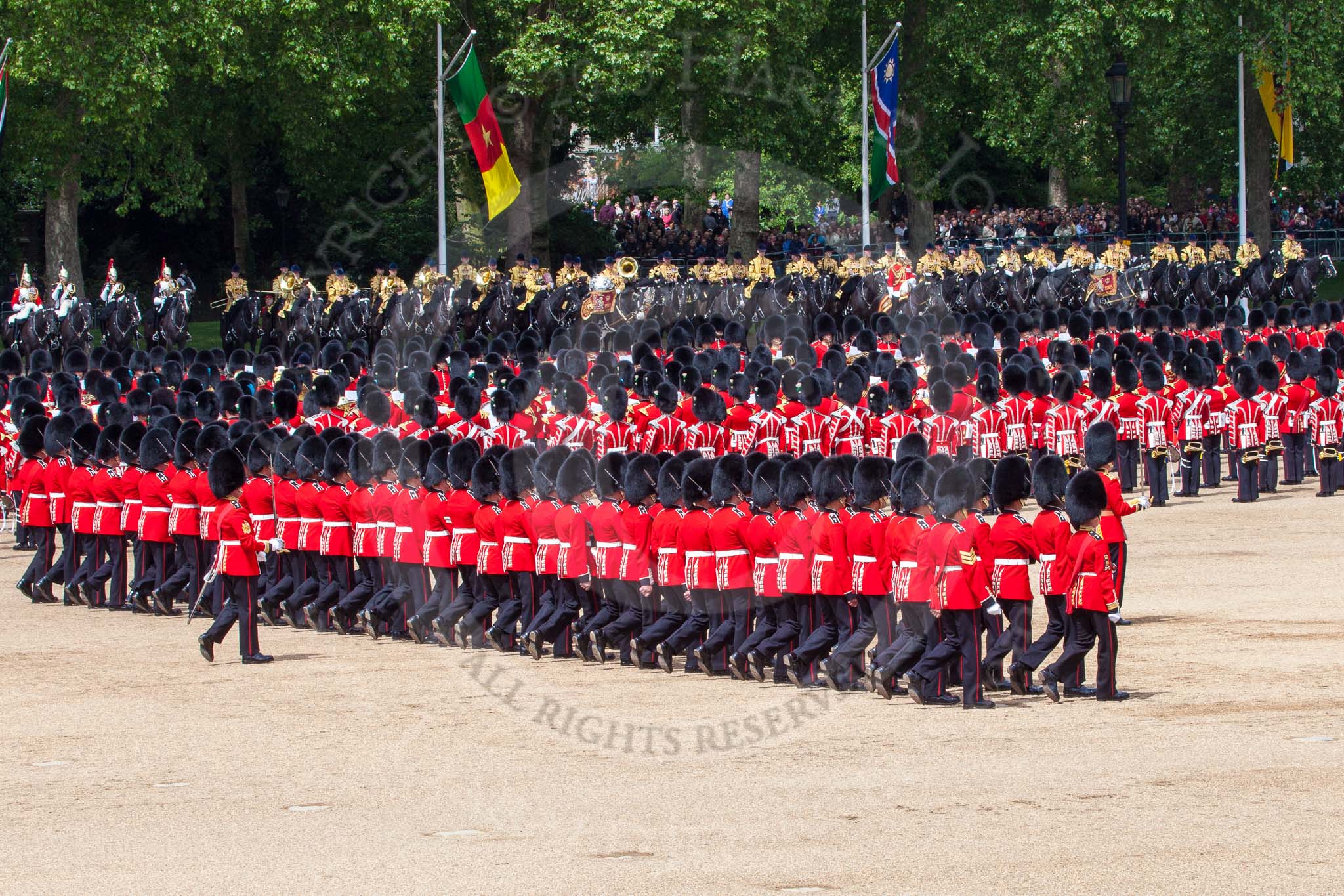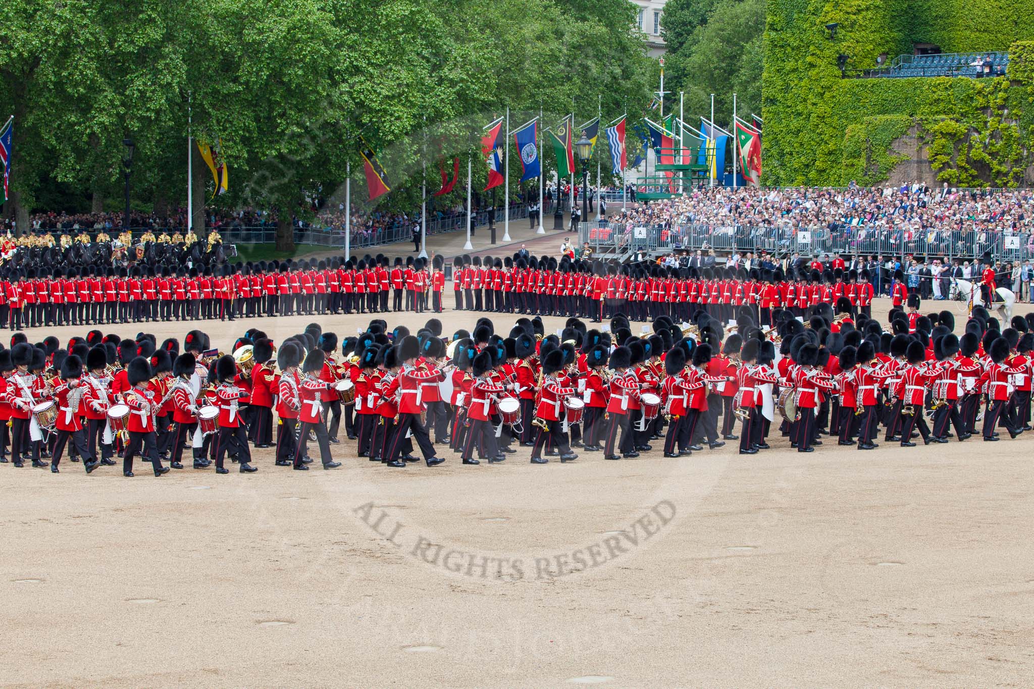 The Colonel's Review 2013: The Massed Bands playing "The British Grenadiers" whilst No. 1 Guard is on the move.. Horse Guards Parade, Westminster, London SW1, United Kingdom, on 08 June 2013 at 11:16, image #485