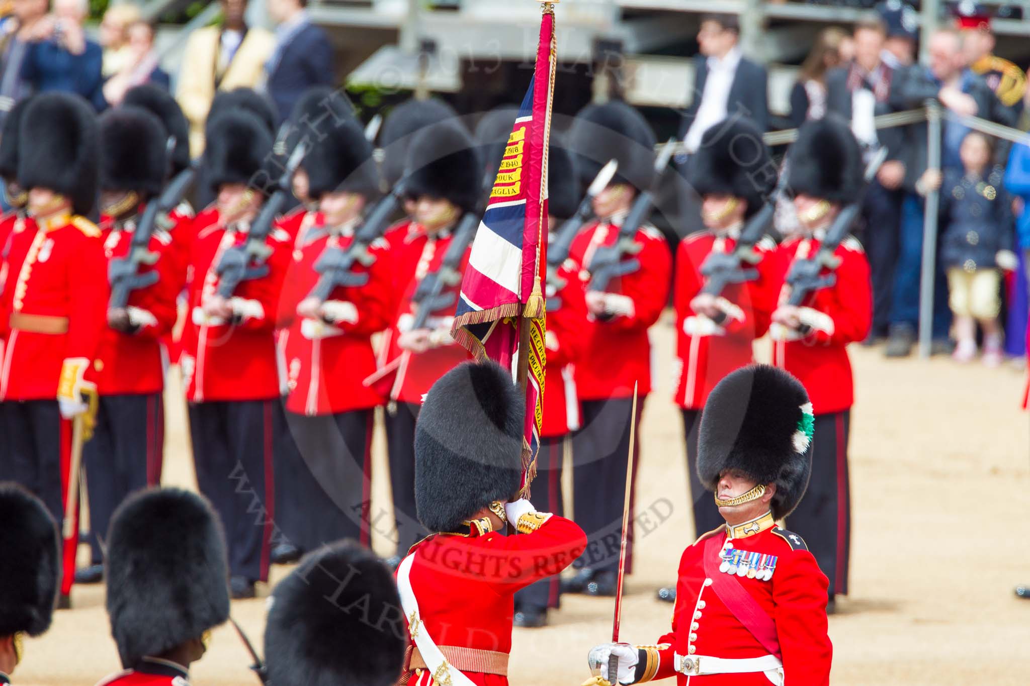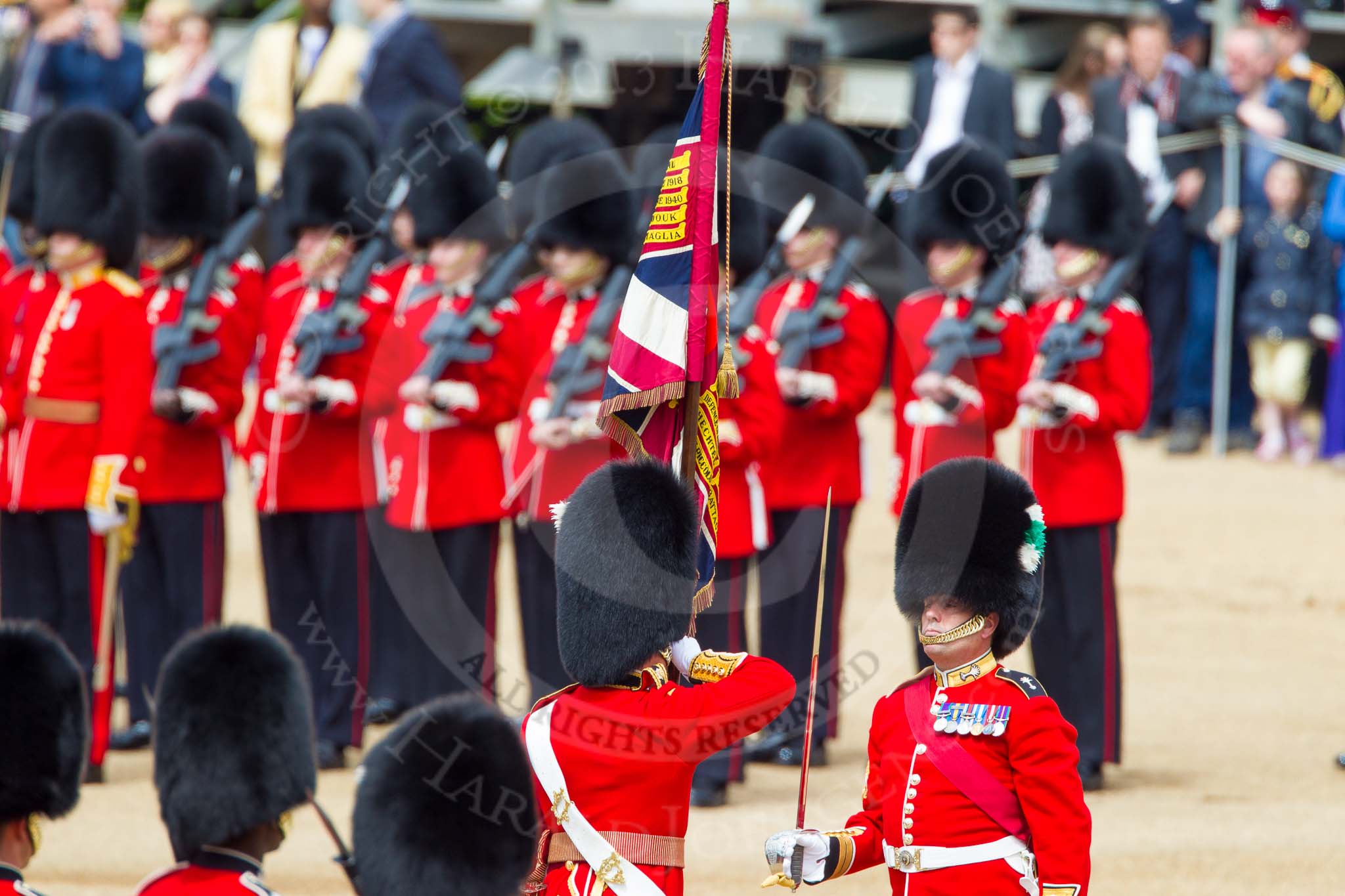 The Colonel's Review 2013: The Ensign, Second Lieutenant Joel Dinwiddle, takes posession of the Colour from the Regimental Sergeant Major, WO1 Martin Topps, Welsh Guards.. Horse Guards Parade, Westminster, London SW1, United Kingdom, on 08 June 2013 at 11:20, image #525