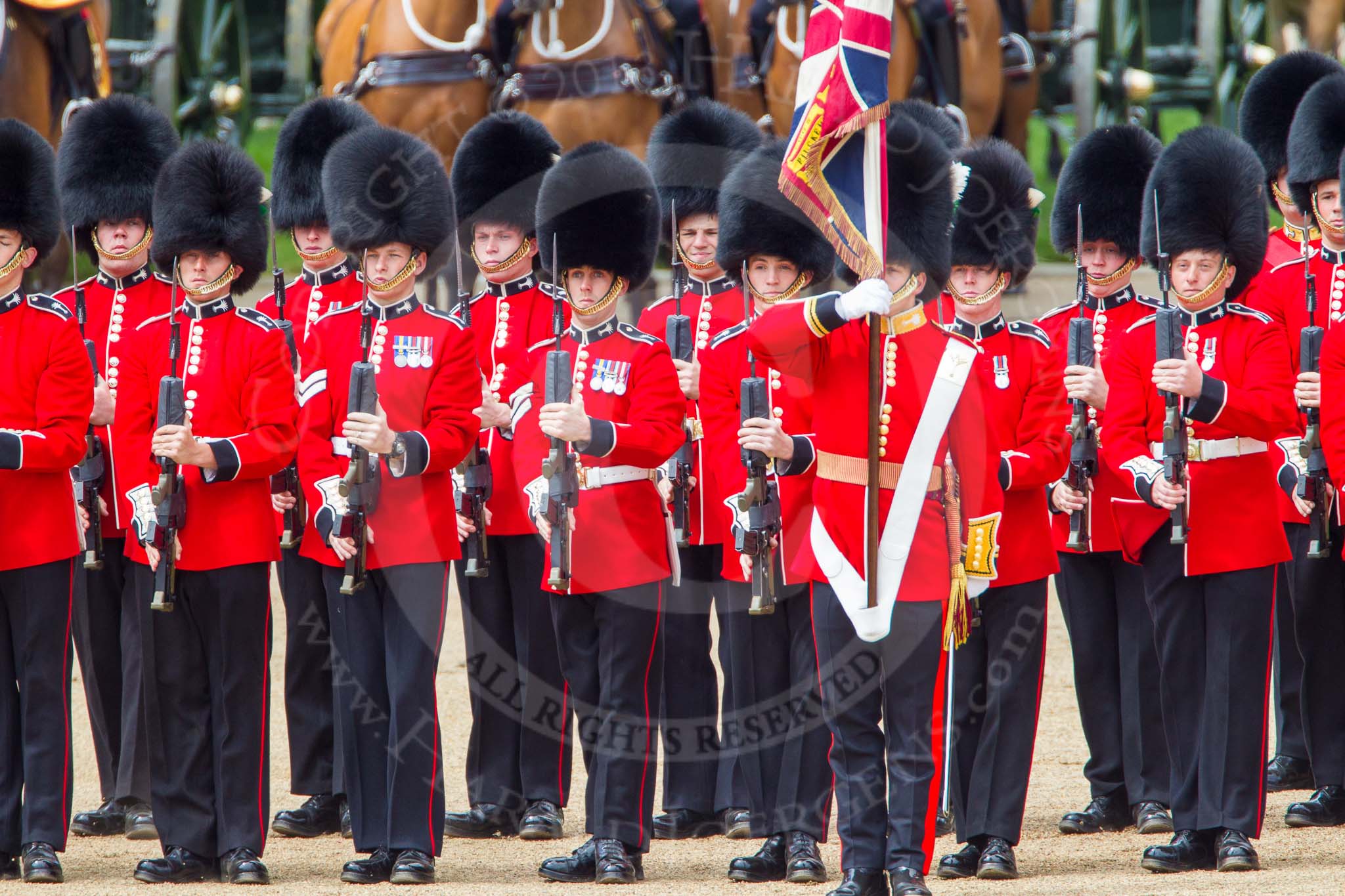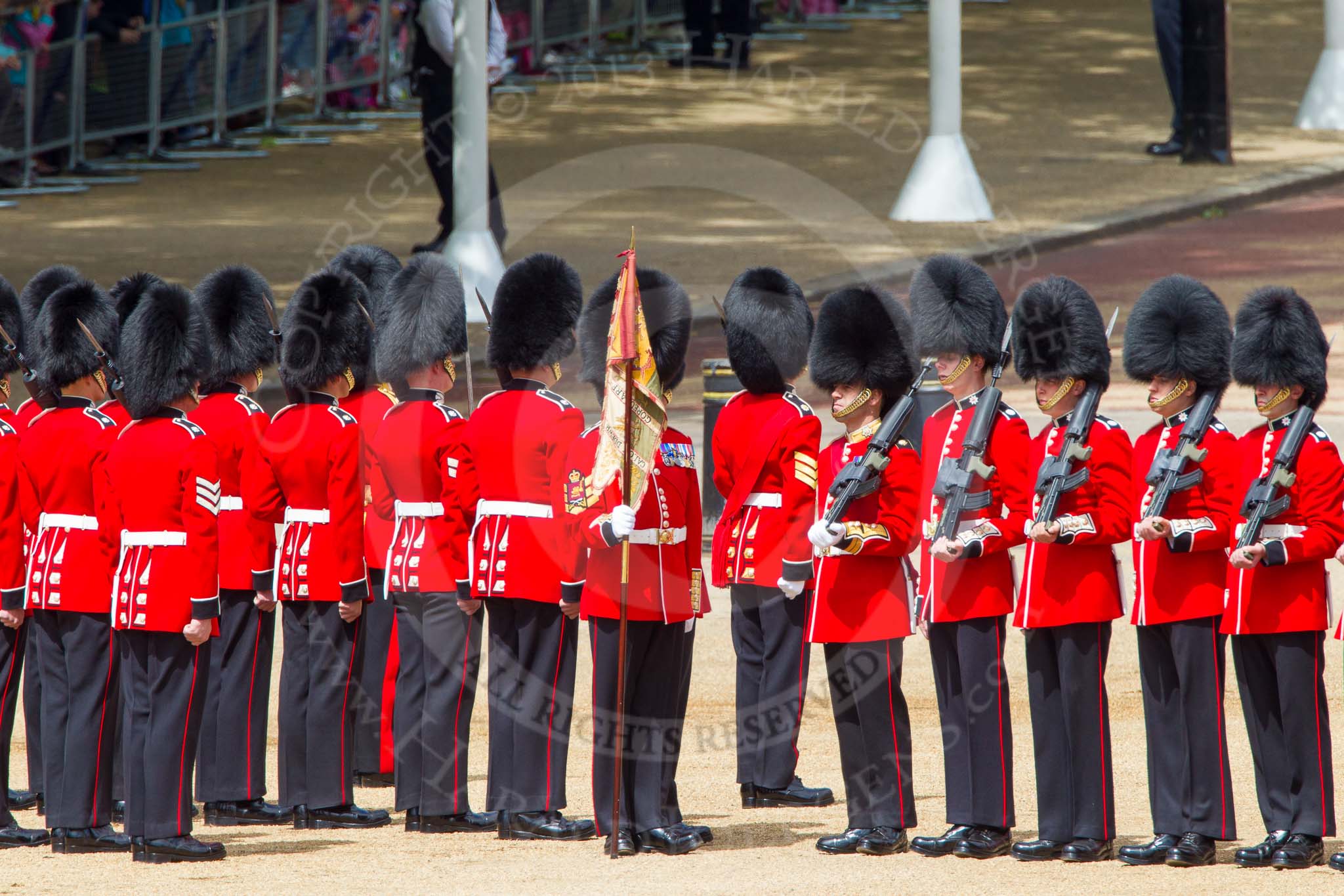 The Colonel's Review 2013: The Ensign, Second Lieutenant Joel Dinwiddle, and the Escort to the Colour,are back at their initial position, when they were the Escort for the Colour. The guardsmen are changing arms.. Horse Guards Parade, Westminster, London SW1, United Kingdom, on 08 June 2013 at 11:27, image #589