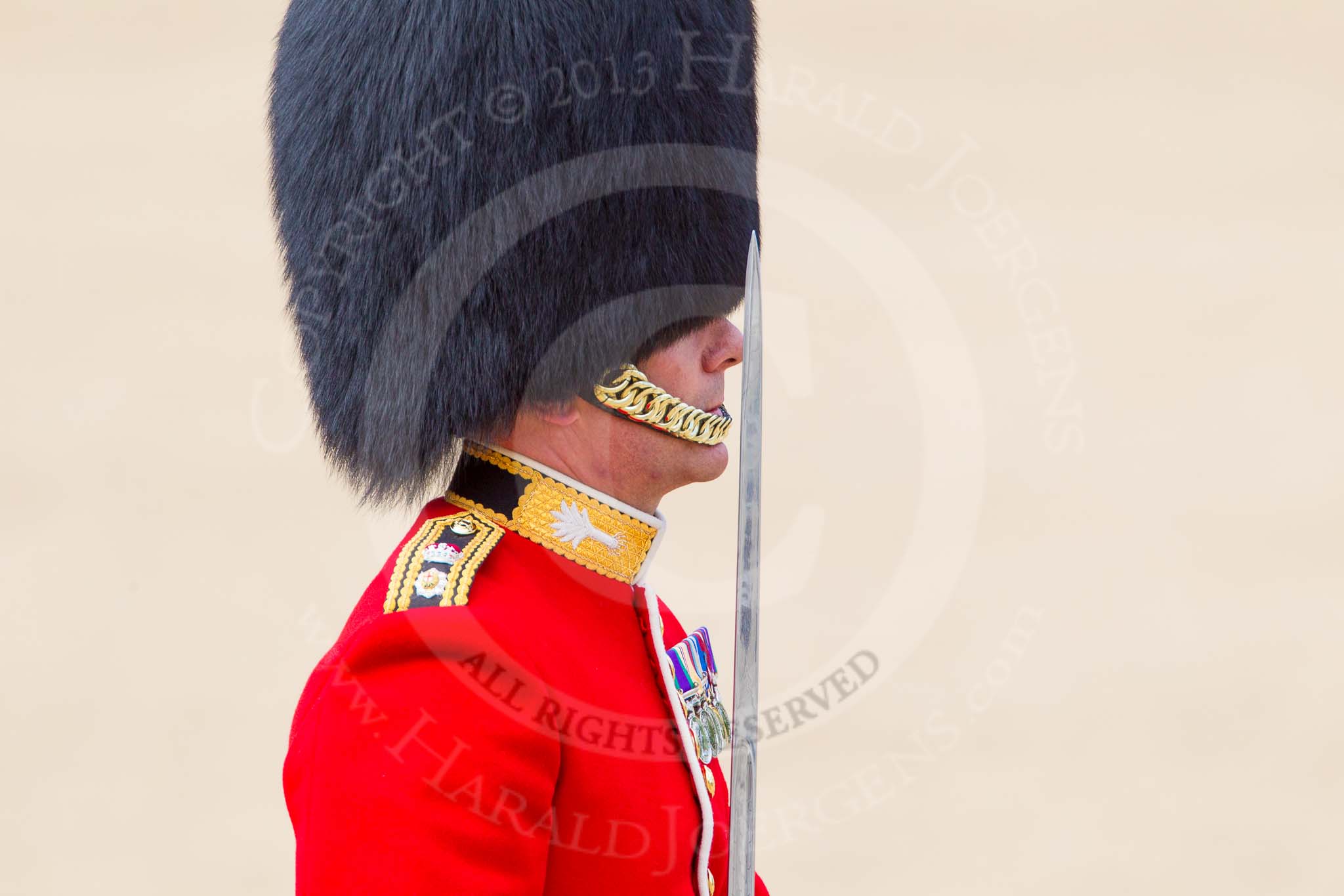 The Colonel's Review 2013: A close-up of the Field Officer in Brigade Waiting, Lieutenant Colonel Dino Bossi, Welsh Guards, with his word drawn, during the March Past..
