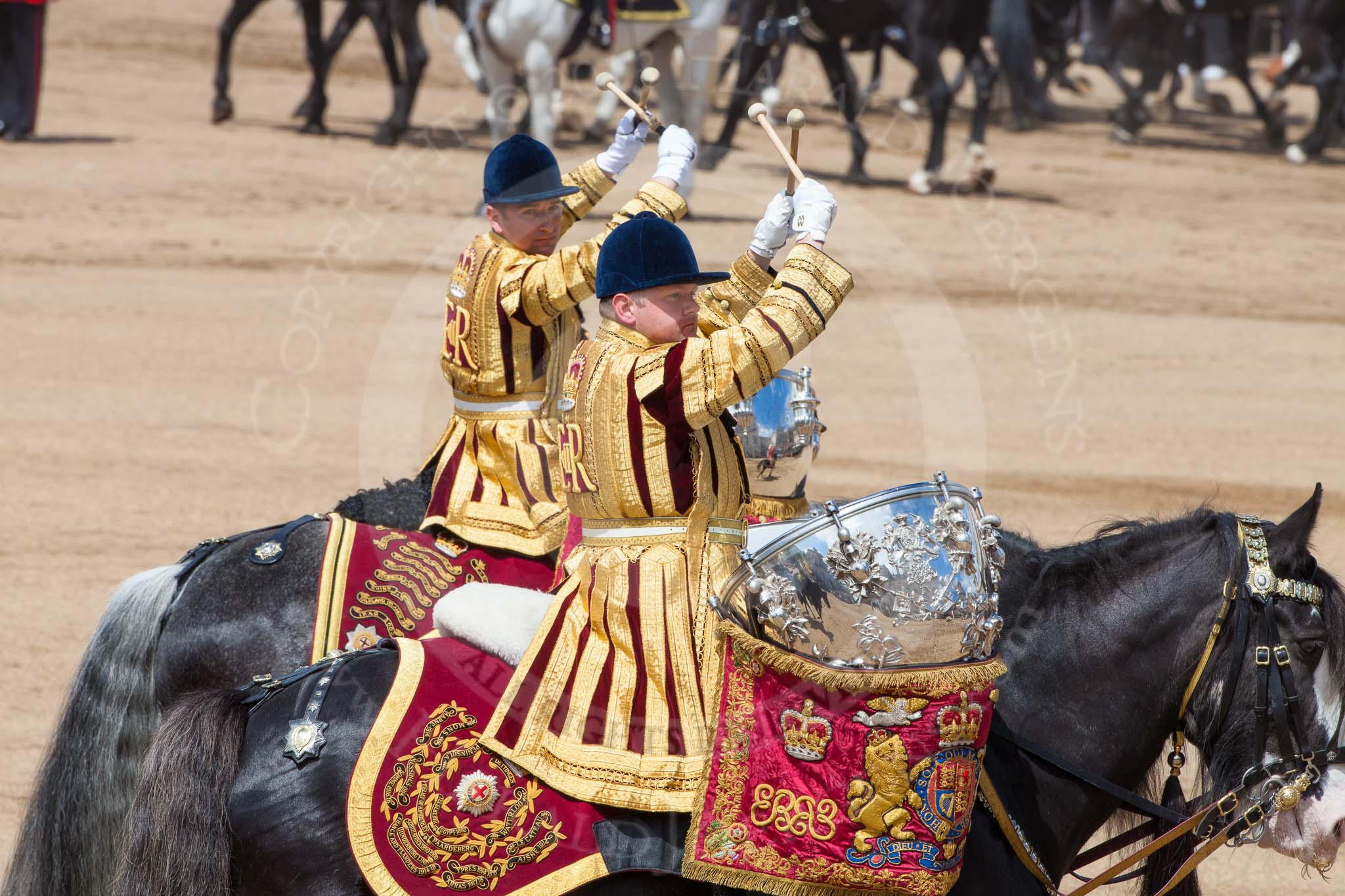 The Colonel's Review 2013: The two kettle drummers, saluting Her Majesty, as the Mounted Bands are about to march off.. Horse Guards Parade, Westminster, London SW1, United Kingdom, on 08 June 2013 at 11:58, image #786