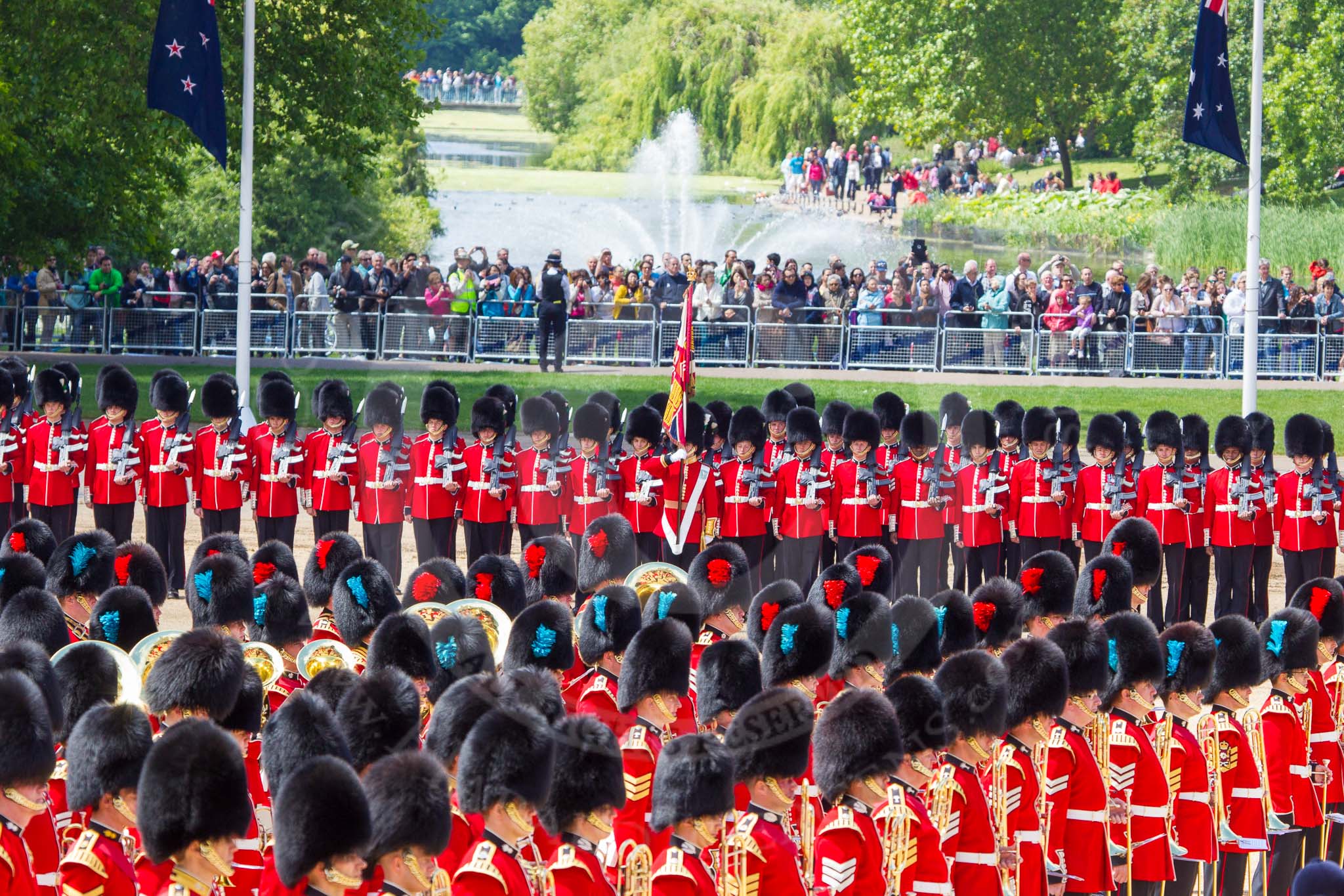 The Colonel's Review 2013: The Massed Bands after the Ride Past. At the back The Ensign, Second Lieutenant Joel Dinwiddle, and the Escort to the Colour.. Horse Guards Parade, Westminster, London SW1, United Kingdom, on 08 June 2013 at 12:00, image #797