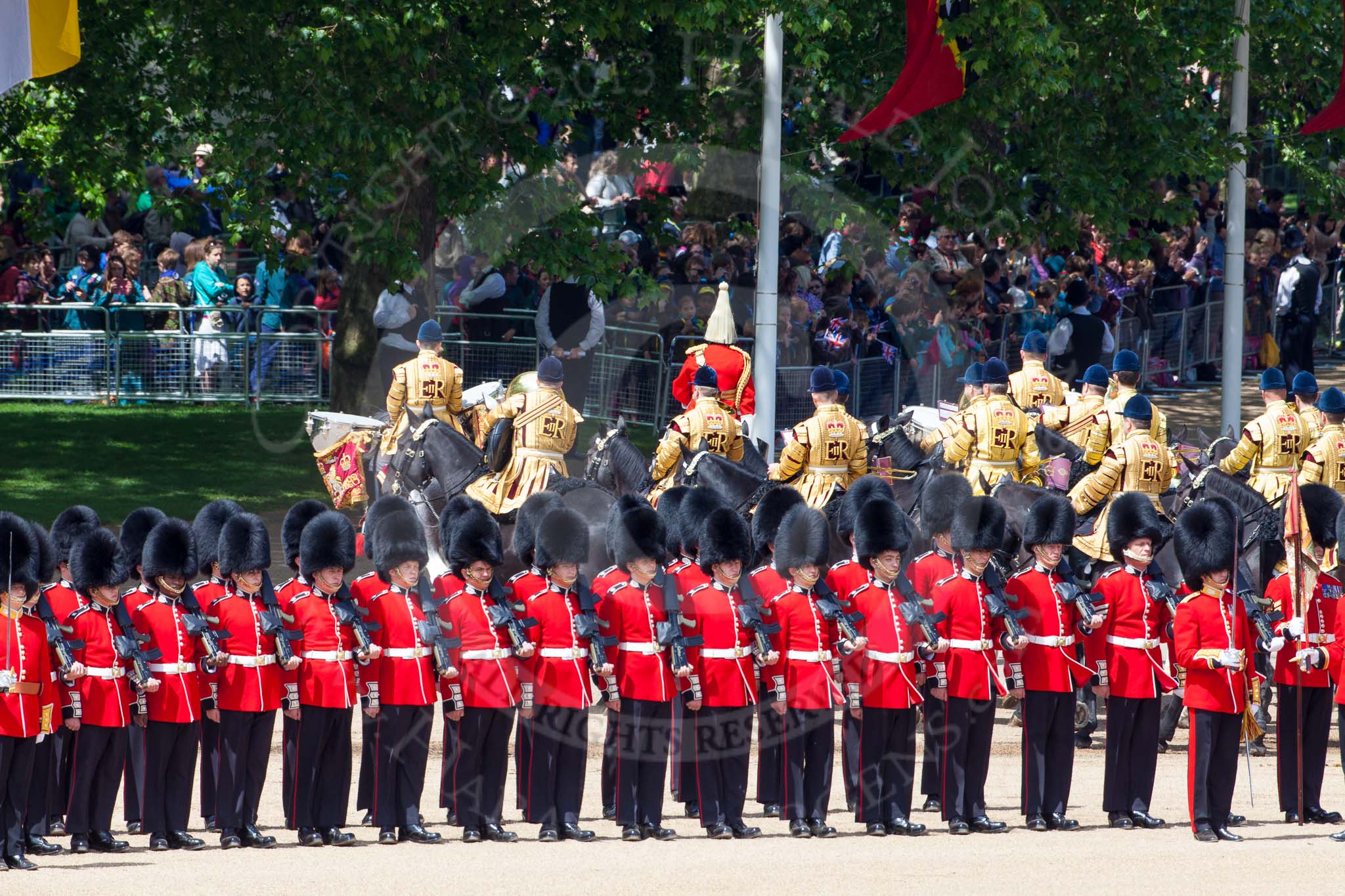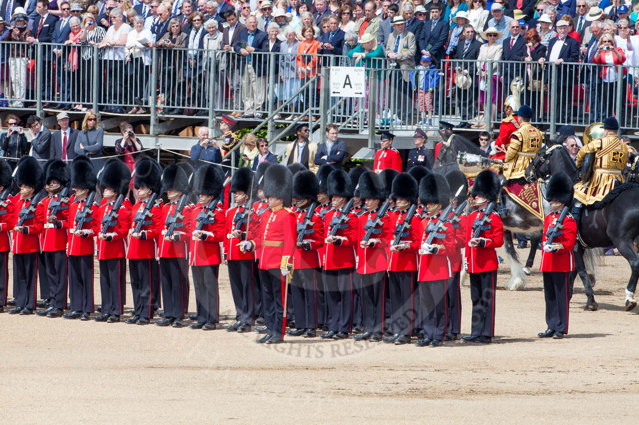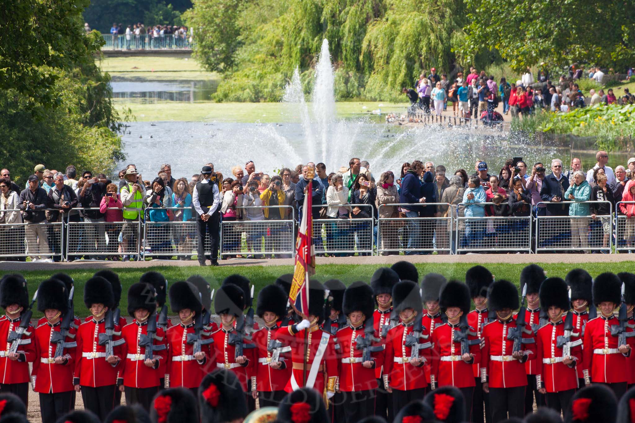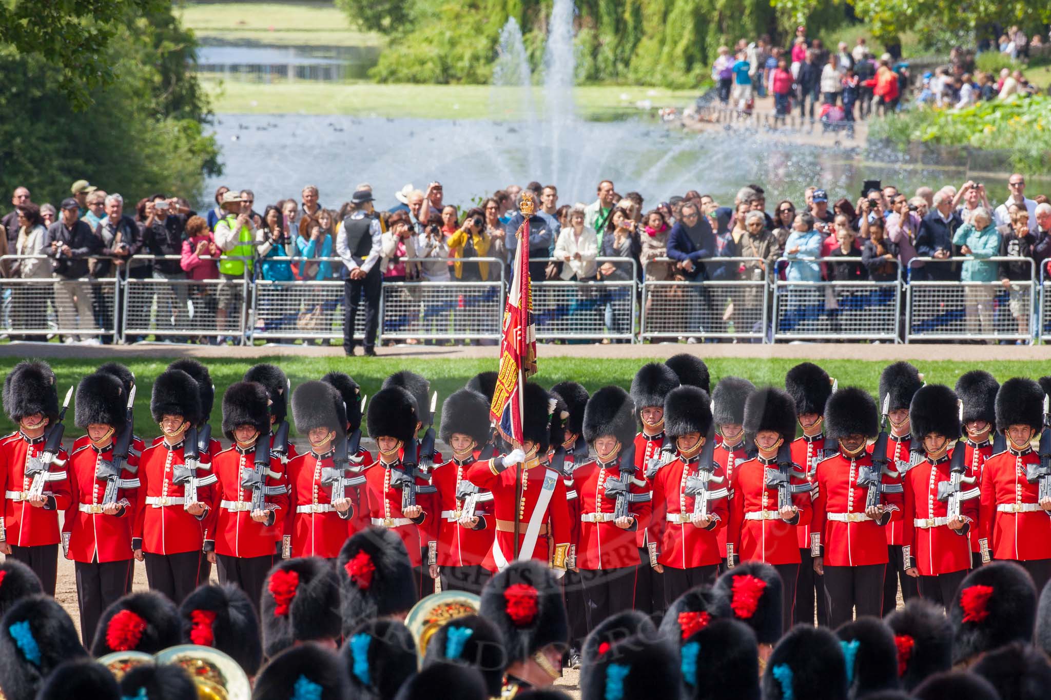 The Colonel's Review 2013: The Massed Bands after the Ride Past. At the back The Ensign, Second Lieutenant Joel Dinwiddle, and the Escort to the Colour.. Horse Guards Parade, Westminster, London SW1, United Kingdom, on 08 June 2013 at 12:00, image #796
