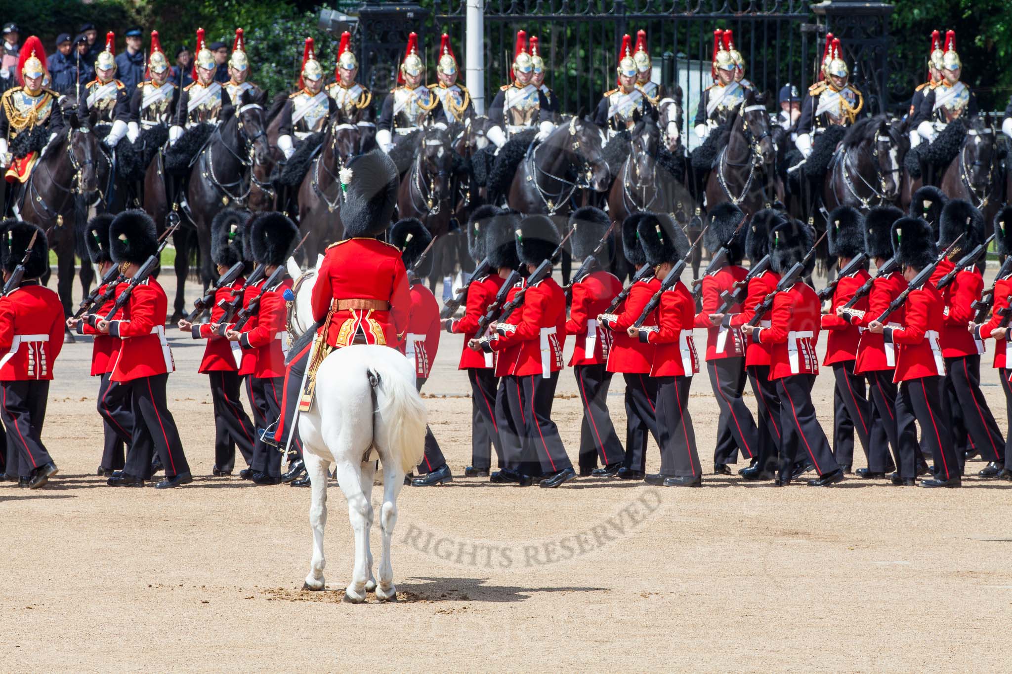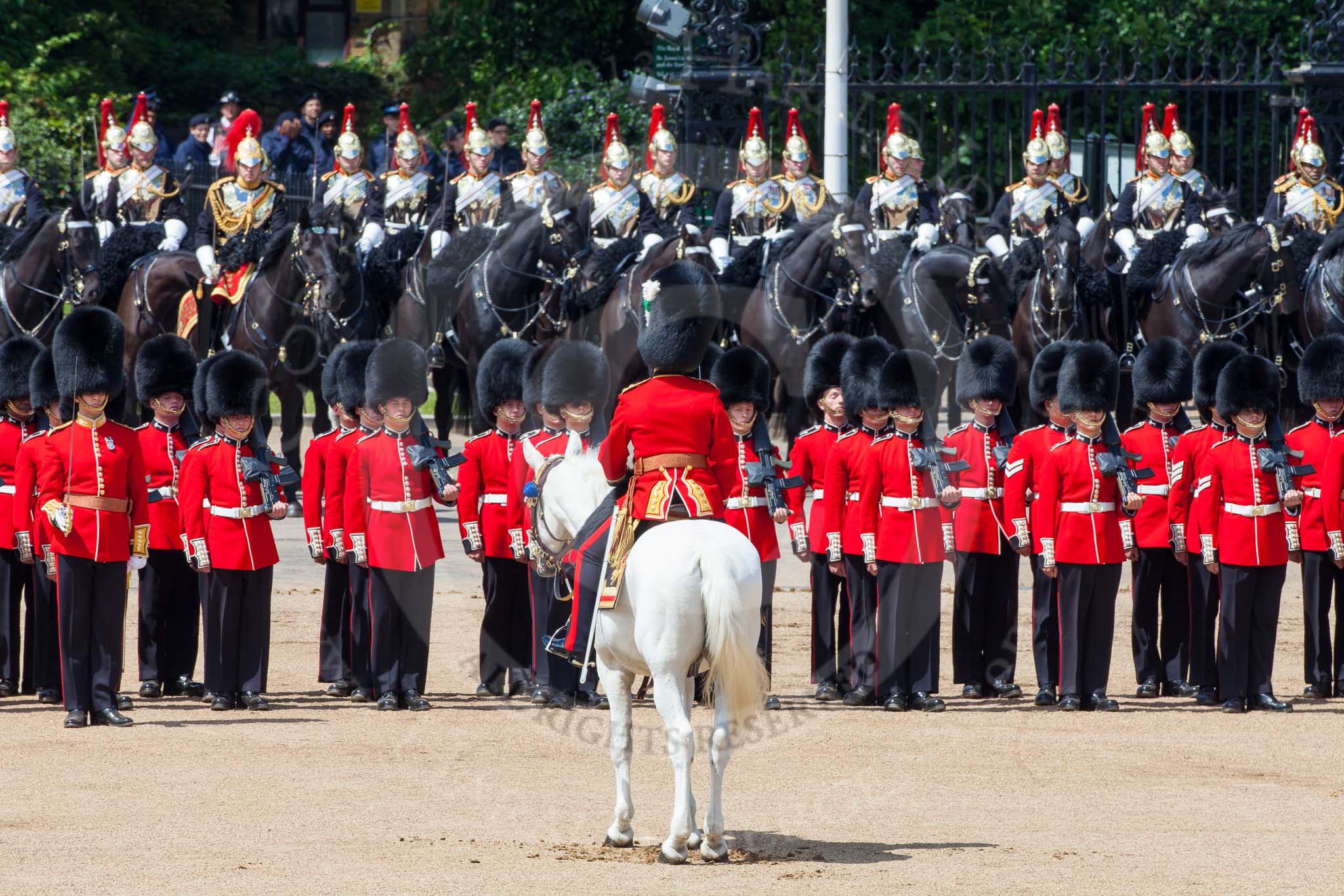 The Colonel's Review 2013: The Field Officer in Brigade Waiting, Lieutenant Colonel Dino Bossi, Welsh Guards, giving orders after the Ride Past.. Horse Guards Parade, Westminster, London SW1, United Kingdom, on 08 June 2013 at 12:02, image #808