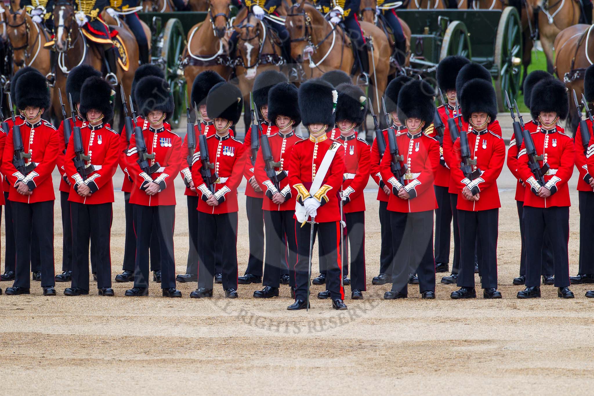 Major General's Review 2013: No. 1 Guard (Escort for the Colour),1st Battalion Welsh Guards, with the Ensign,Second Lieutenant Joel Dinwiddle in the centre, the King's Troop Royal Horse Artillery behind..