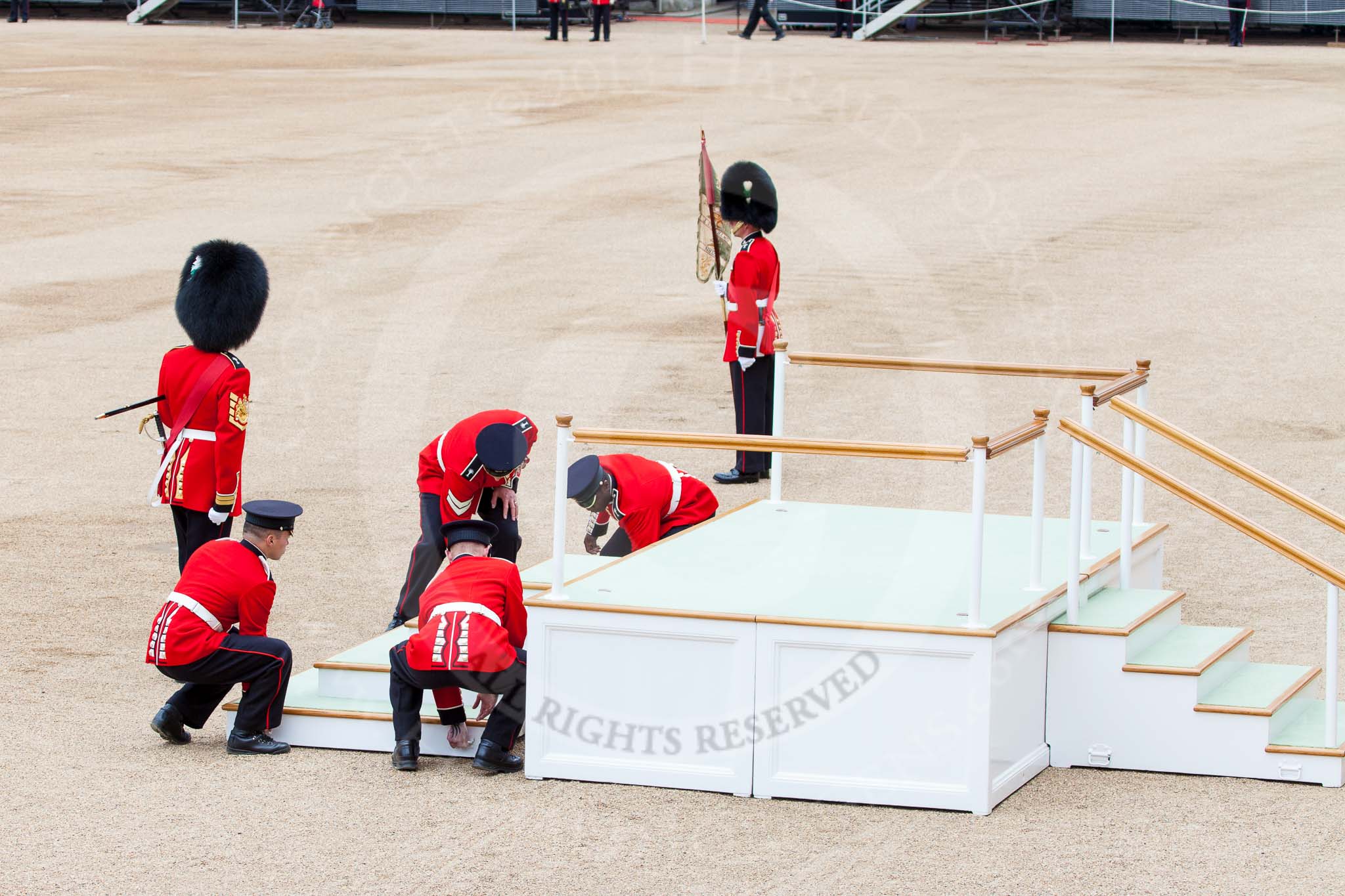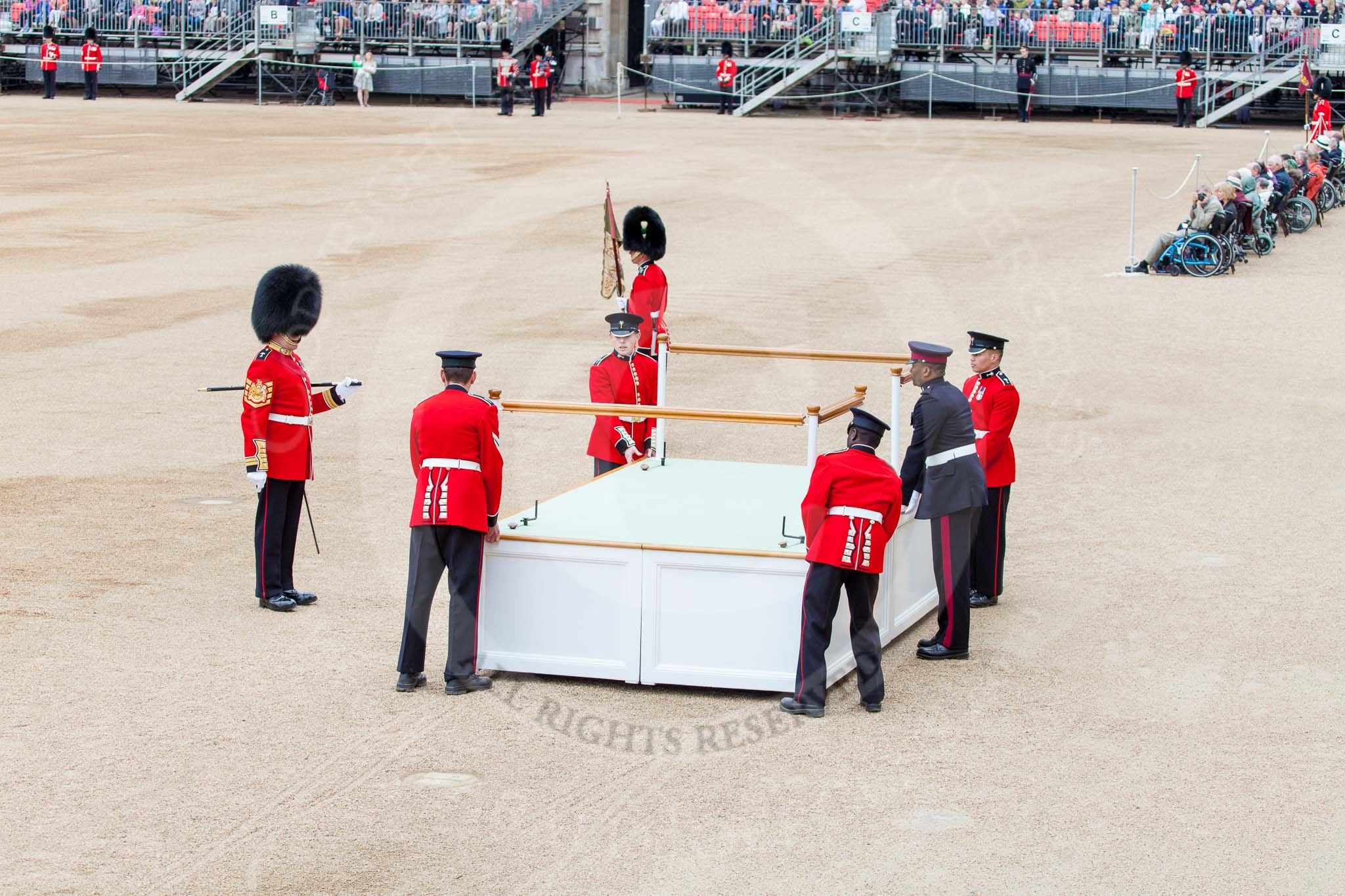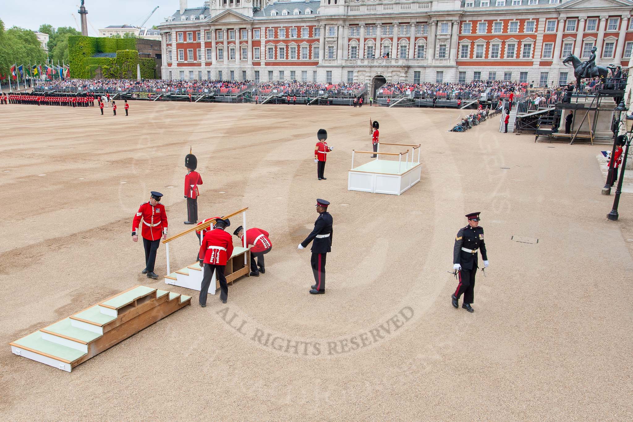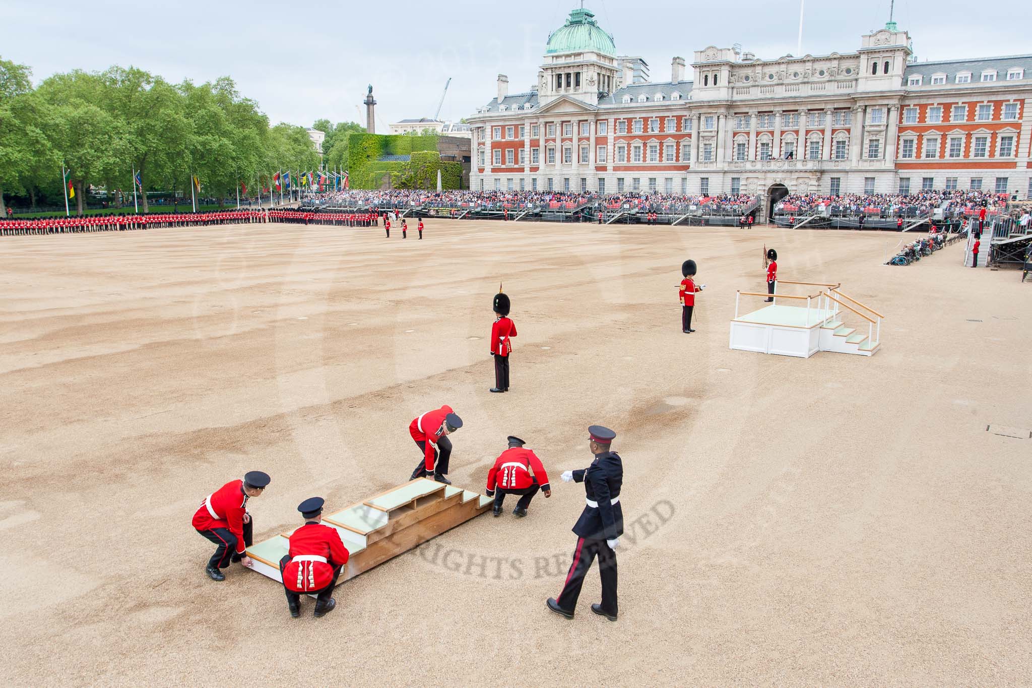 Major General's Review 2013: The dais, the saluting platform for HM The Queen, is moved into place in front of Horse Guards Arch, after the carriages have passed.. Horse Guards Parade, Westminster, London SW1, United Kingdom, on 01 June 2013 at 10:53, image #212