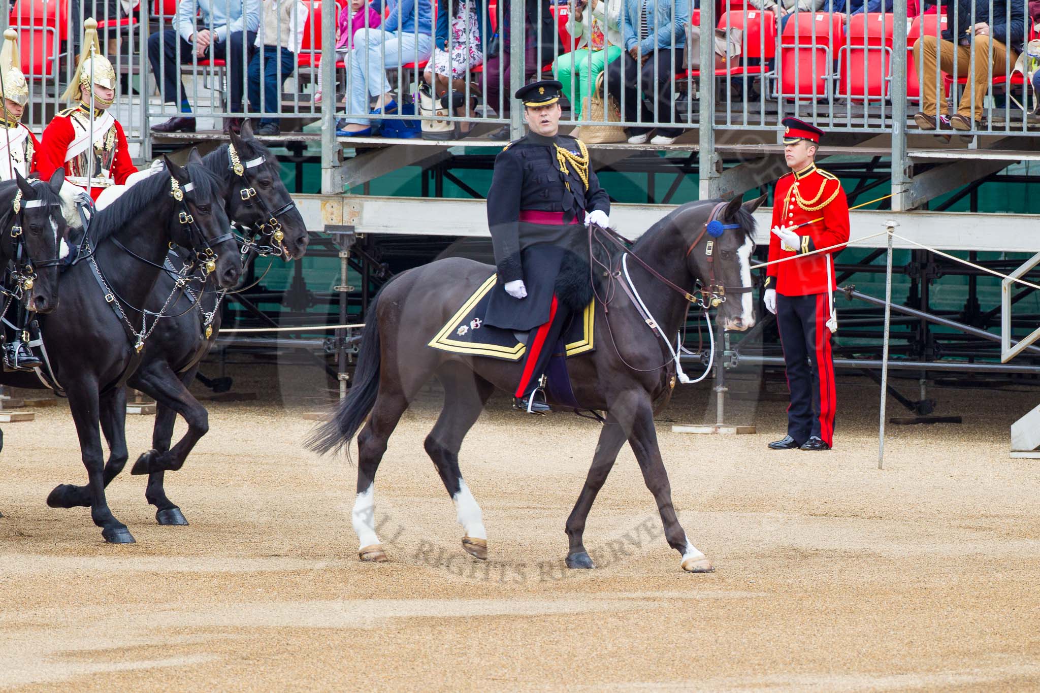 Major General's Review 2013: Leading the Royal Procession from The Mall onto Horse Guards Parade - Brigade Major Household Division Lieutenant Colonel Simon Soskin, Grenadier Guards, followed by four Troopers of The Life Guards.. Horse Guards Parade, Westminster, London SW1, United Kingdom, on 01 June 2013 at 10:56, image #222