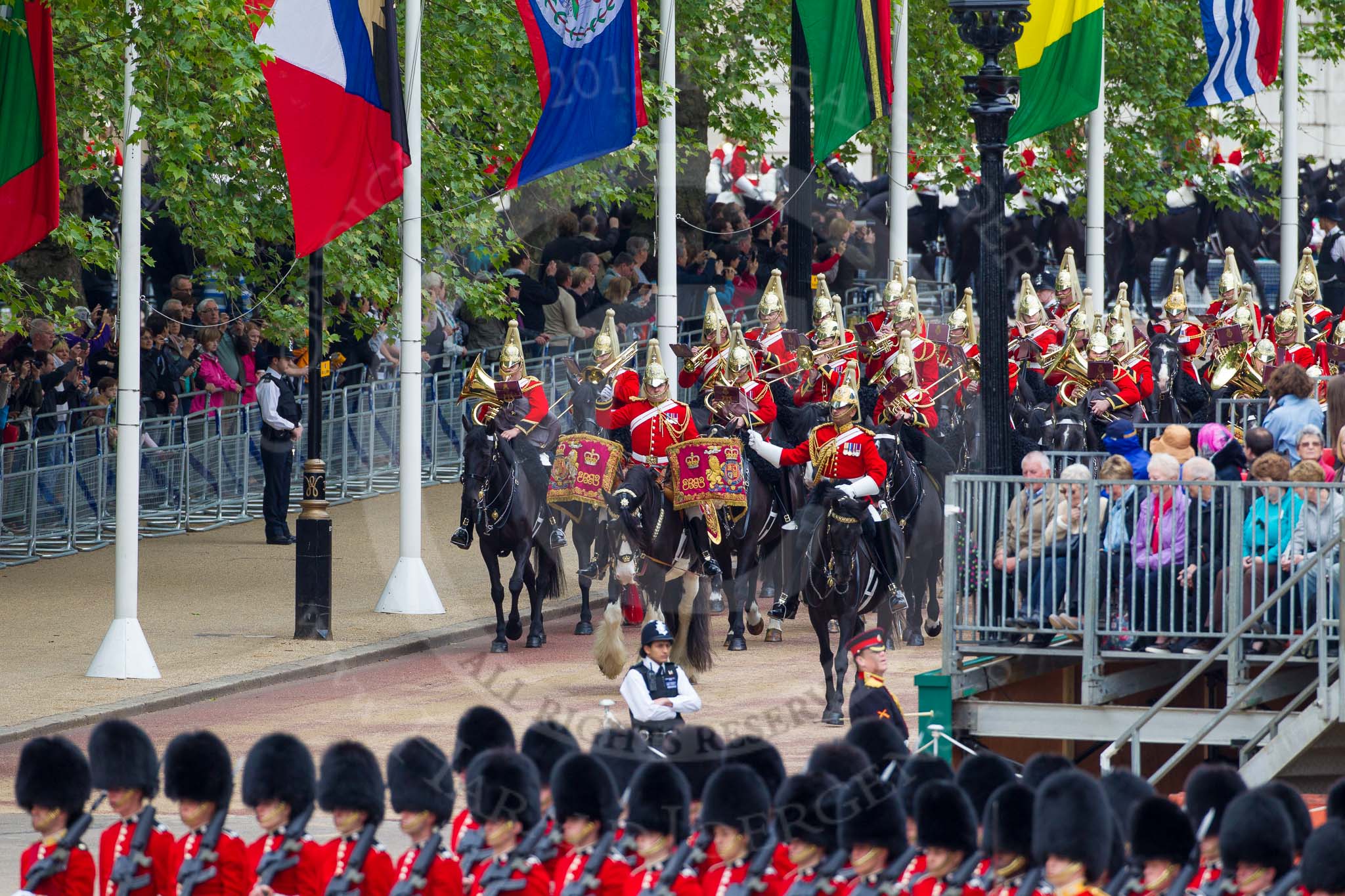 Major General's Review 2013: The Mounted Bands of the Household Cavalry are marching down Horse Guards Road as the third element of the Royal Procession.. Horse Guards Parade, Westminster, London SW1, United Kingdom, on 01 June 2013 at 10:56, image #225