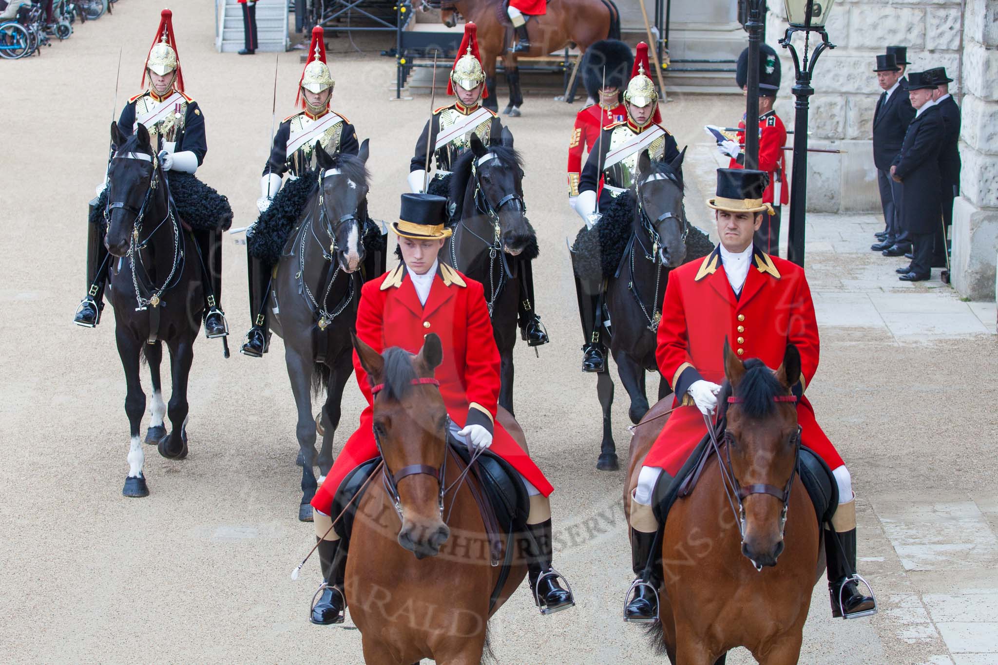 Major General's Review 2013: Two Grooms, The Royal Household followed by Four Troopers of The Blue and Royals (Royal Horse Guards and 1st Dragoons).. Horse Guards Parade, Westminster, London SW1, United Kingdom, on 01 June 2013 at 11:02, image #284